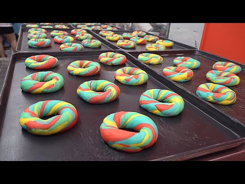 הכנת בייגל צבעוני בקשת בענן, גבינת שמנת - אוכל רחוב קוריאני
