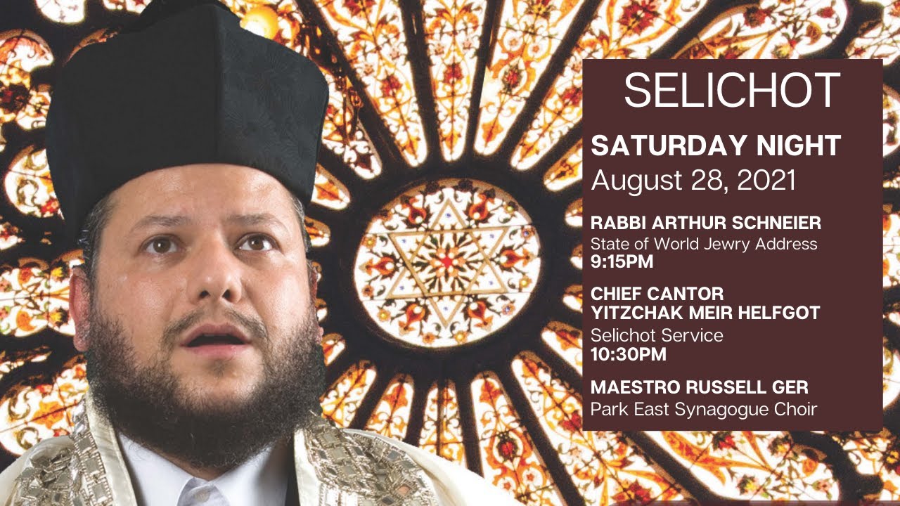 Selichot Saturday Night | August 28 | 2021 9:15 pm • State of the World Jewry Address Rabbi Arthur Schneier “Israel & The Jewish People in a World of Upheaval and Realignment” 10:30 pm • Selichot Service Chief Cantor Yitzchak Meir Helfgot Maestro Russell Ger Park East Synagogue Choir #ParkEastSynagogue #Selichot #YitzchakMeirHelfgot