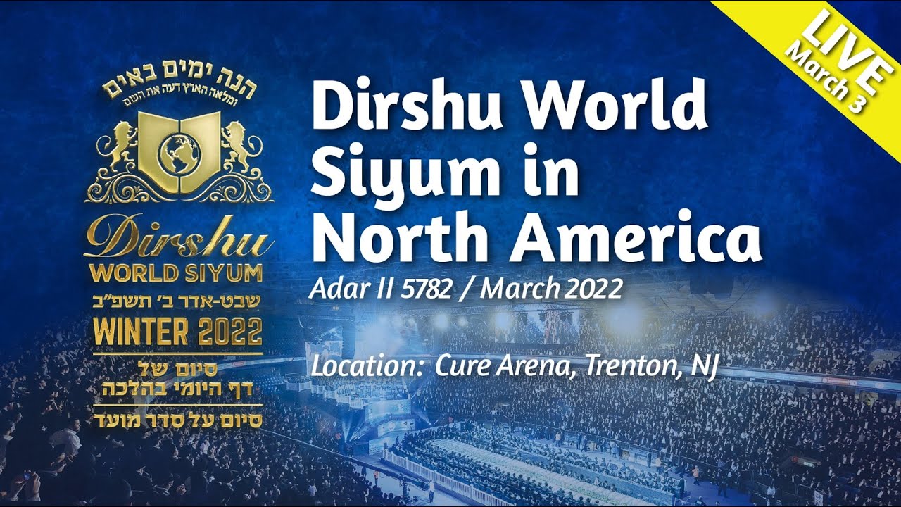 View The North American Dirshu World Siyum Marking The Completion of The Second Machzor of DafHaYomi B’Halacha At the Cure Arena in Trenton, New Jersey, there will be a colossal display of K’vod Shomayim takingplace. The Cure Arena will be filled with members of Klal Yisrael, Yidden who are there to celebrate onething. That being, Dirshu’s Siyum on the Machzor Sheini of Daf HaYomi B’Halacha! In addition to the tremendous number of Torah-loving Jews filling the seats at the arena, creating anunparalleled sense of Ruchniyis and Kavod HaTorah, the event will certainly be one that none will soonforget, and will feature Divrei Bracha from senior Gedolei Yisroel and inspirational niggunim from ZanvilWeinberger, Motti Steinmetz, Naftali Kempeh, and others. Dirshu extends a hearty Mazel Tov to all those participating in this incredible event.Mazel tov, lomdei Dirshu! Mazel tov Klal Yisrael! #Dirshu #Siyum #Live