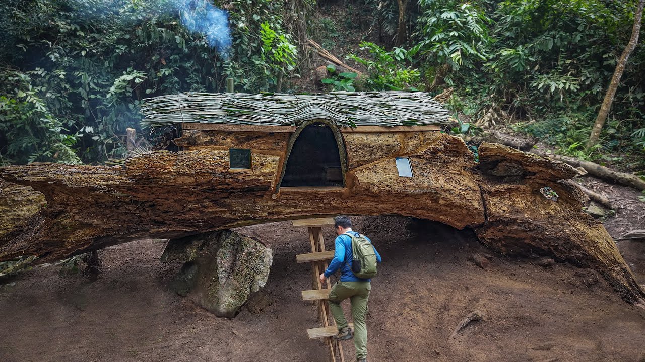 I went back to the giant tree trunk I built in the previous video. In this video, when I returned to the roof, the bark had dried out, creating holes through which rain could penetrate. Using nearby materials, I added a large door and a more cohesive roof structure. For the roofing, I chose leaves because if done correctly, the roof would last longer without leaking. Now it's winter here; there's no snow, but with the rain and high humidity, the weather will be colder than even snowy regions. Then I rebuilt a stove with bamboo pipes to conduct heat to my bed. I also made some Bushcraft tools myself. To survive in the forest, I've mastered all the skills of a true bushcraftsman. I hope you enjoyed it! #bushcarft #Survival #DIY #offgirdliving #outdoors