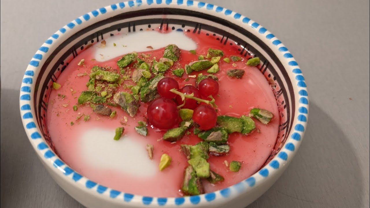 Pour the malabi into serving bowls/cups while still hot. Before serving add syrup, decorate with pistachios.
