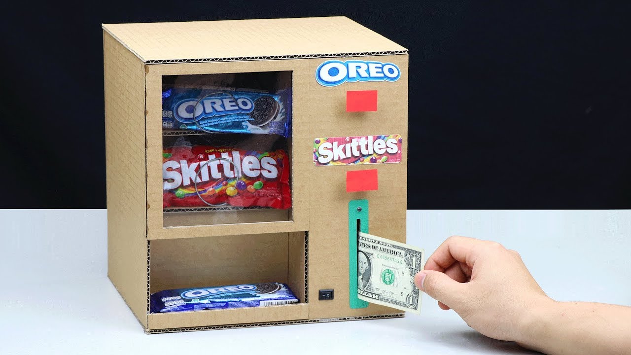 Wow! How to make amazing OREO and Skittles vending machine from cardboard operated with money. It's really awesome DIY vending machine project. I hope everyone like this idea. Thank you for watching!! Please subscribe to get more interesting videos: https://www.youtube.com/channel/UCNZMEiM-ZMYmEk2CG3mr1_Q?sub_confirmation=1 You need: - 9v battery - DC motors - Mini servo motor - Switch - Electric wire and battery connector wire - Rubber band - Plastic gears - Iron wire - Pens - Ice-cream stick - BBQ bamboo stick and chopstick - Cardboard Cardboard Measurement: ===================== (cm = centimeter) 1,5cm x 16cm = 1 piece 5cm x 16cm = 1 piece 7cm x 15cm = 1 piece 8cm x 15,5cm = 2 pieces 9,7cm x 15cm = 1 piece 10cm x 26cm = 1 piece 15cm x 26cm = 1 piece 15,5cm x 26cm = 1 piece 16cm x 15cm = 1 piece 22cm x 26cm = 2 pieces 23cm x 26cm = 2 pieces 26cm x 26cm = 1 piece