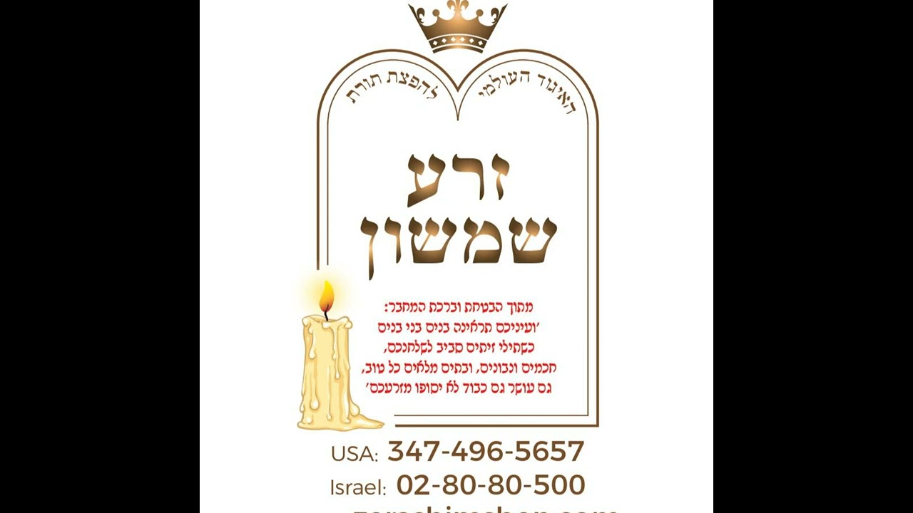 Presented by the World Organization for the Distribution of the Torah of Zera Shimshon. The study of the book Zera Shimshon is most conducive to receiving blessings and salvation, as its author assured: “And with your eyes you will see children, and the children of your children, like olive trees around your tables, wise and knowledgeable; and houses full of everything good; both wealth and honor will not cease from your offspring”. The great Gaon, giant in Torah, Rabbi Chaim Kanievski, zt’l, testifies that it is proven that the study of this book is mystically conducive to obtaining salvation and blessing. Thousands of people testify about the salvation and wonders they experienced because of their study. Do not leave it for later. Do not miss it. This is the opportunity to deserve the salvation and blessing that you and your families need. For more details about the books, for assistance or for donations in fulfillment of the request of the sacred author to have the merit of the blessing, you can contact us by the following means: Email: zera277@gmail.com Website: www.zerashimshon.com Phones: In Israel: Harav Israel Zilberberg: + 972-2-80-80-500 In the United States: Harav Menachem Binyamin Fashkas: + 1-347-496-5657 https://play.google.com/store/apps/details?id=com.kesherhk.zerashimshon מוגש על ידי 'האיגוד העולמי להפצת תורת זרע שמשון'. הלימוד בספר זרע שמשון מסוגל ביותר לברכות ולישועות וכהבטחת המחבר 'ועיניכם תראינה בנים ובני בנים כשתילי זיתים סביב לשולחנכם חכמים ונבונים ובתים מלאים כל טוב גם עושר גם כבוד לא יסופו מזרעכם'. הגאון הגדול שר התורה רבי חיים קנייבסקי זצ׳ל, העיד שהלימוד בספר סגולה בדוקה לישועה וברכה. אלפים מעידים על ישועות ונפלאות. אל תחמיצו. אל תפספסו. זו ההזדמנות שלכם לזכות לישועה ולברכה עבורכם ועבור משפחתכם. ליתר פרטים בענין הספרים, לסיוע ולתרומות לקיום בקשת המחבר הקדוש לזכות ולברכה פנו לאתר: zerashimshon.com או במייל: zera277@gmail.com או בטלפון: ארץ ישראל הרב ישראל זילברברג 02-80-80-500 ארה"ב הרב מנחם בנימין פאשקעס 347-496-5657 https://play.google.com/store/apps/details?id=com.kesherhk.zerashimshon