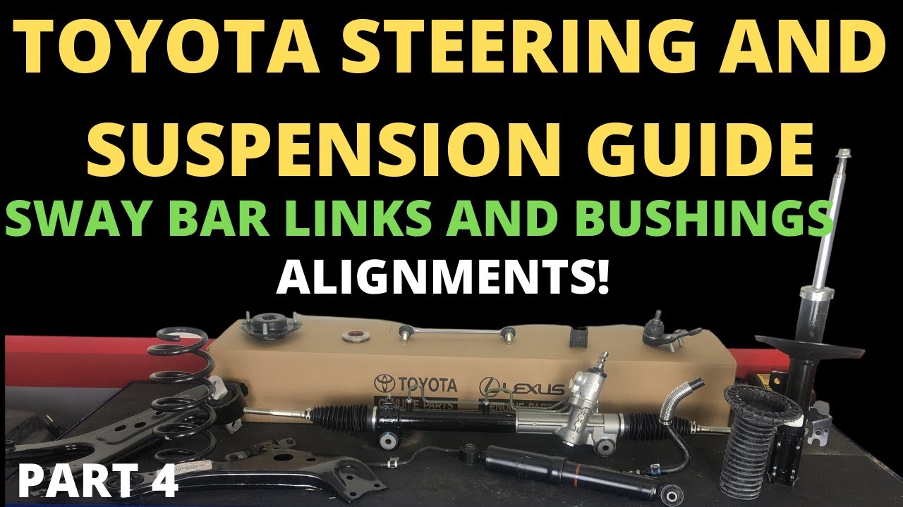 In this part of the series, I will be talking about Toyota Sway bars including Sway bar or stabilizer bar bushings and links. I'll also cover alignments for various Toyota models.