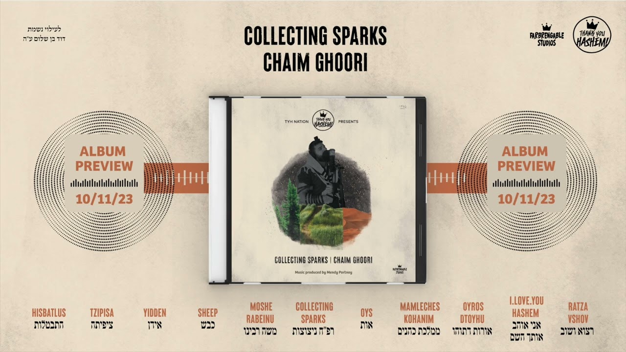 TYH Nation Presents - COLLECTING SPARKS - Chaim Ghoori - ALBUM RELASE DATE 10/11/2023 1: Hisbatlus - התבטלות 2: Tzipisa - ציפיתה 3: Yidden- אידן 4: Sheep - כבש 5: Moshe - משה רבינו 6: Collecting Sparks - רפ״ח ניצוצות 7: OYS - אות 8: Mamleches Kohanim - ממלכת כהנים 9: Oyros - אורות דתוהו 10: I love You Hashem - אני אוהב אותך השם 11: Raztah Vshav - רצוא ושוב For bookings: +1 (347) 680-4862 bookings@gmail.com Farbrengable Studios Music produced by Mendy Portnoy Cover art by Yehuda Raice