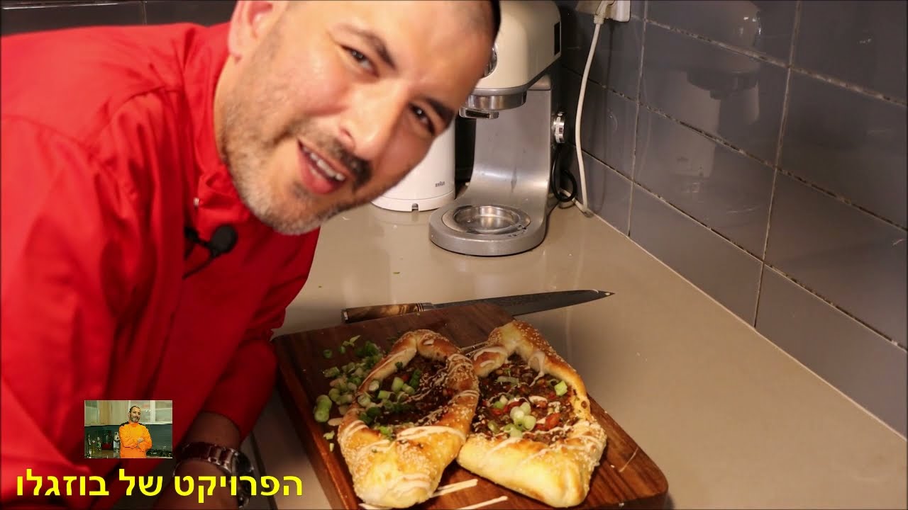 מתכון לבצק 1 קילו קמח 3 כוסות מים פושרים 1 שמרית או 2 כפות שמרים 6 כפות שמן זית 2 כפות סוכר כף מלח דק המילוי לבצק 1 קילו גר בשר מס 2 טחון או בשר טלה טחון 2 בתל אדום קצוץ דק גמבה אדומה קצוצה דק 1 פלפל חריף ירוק קצוץ דק 2 פלפל צ'לי קצוץ דק 2 עגבניות קוביות קטנות צרור בזיליקום קצוץ דק צרור פטרוזיליה קצוצה דק כף אורגנו יבש או טרי כף מלח כף פפריקה מתוקה כף פלפל שחור 5 שיני שום כתוש חצי כוס צנובר 1 ביצה למריחה על הבצק לקישוט שמשום בצל ירוק קצוץ שמן זית טחינה בהצלחה מימון בוזגלו