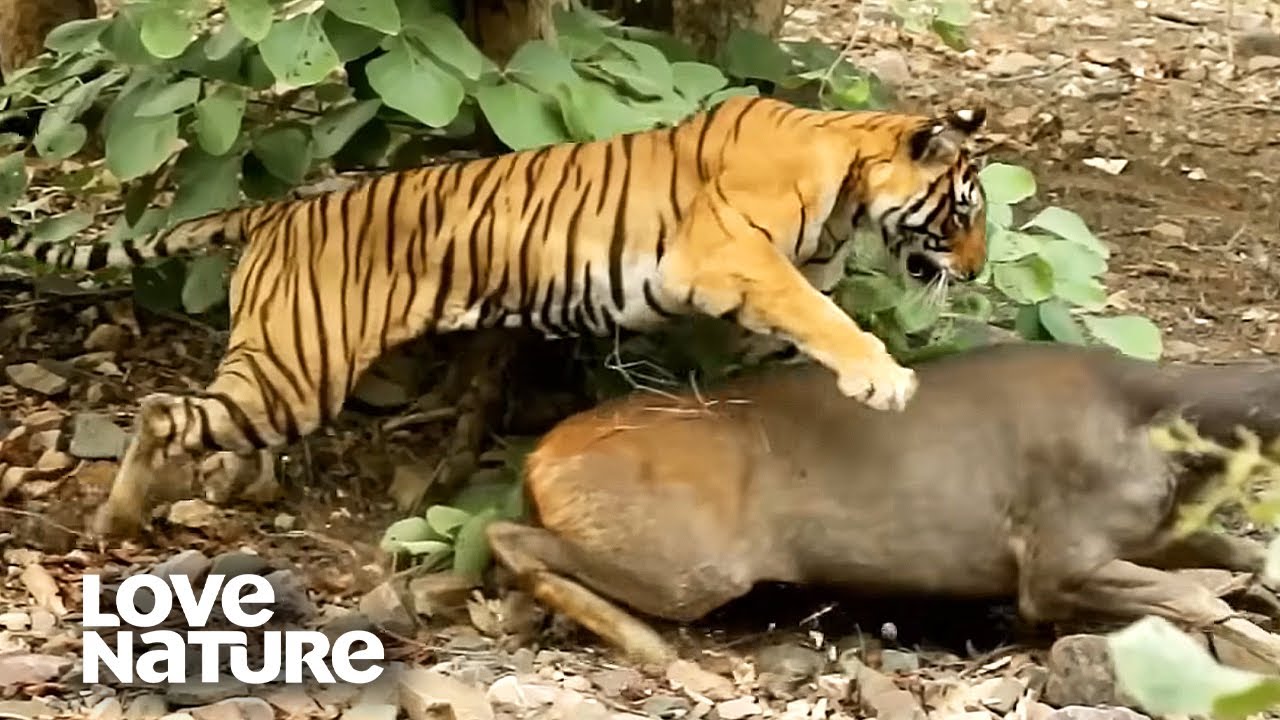 Mother tiger Rana and her young family live in Nagarhole National Park, in Southern India. Her plight is shared by many tigers in this part of India, caused largely by humans who have poached their prey and encroached on their habitat. Now, there are less than 2500 bengal tigers left. Rana isn't licked yet, and stumbles upon a clearing where plenty of prey reside. A lone Sambar deer heads to the woods alone, and Rana just may have a shot at him. She waits patiently in the bushes, and surprises the Sambar to his demise. Rana has succeeded, and calls her cubs to come feast. The tigers will eat for the next 4 days, and live to hunt another day. Watch Love Nature Anywhere: https://lovenature.com/channel-finder/ Love Nature on ROKU: https://bit.ly/3DBafVw Subscribe to Love Nature YouTube Channel: http://bit.ly/LoveNatureYT Make sure to also subscribe to our other socials: Facebook: http://bit.ly/LoveNatureFB Instagram: http://bit.ly/LoveNatureIG Twitter: http://bit.ly/LNTwitter2 #animals #tiger #bengaltiger