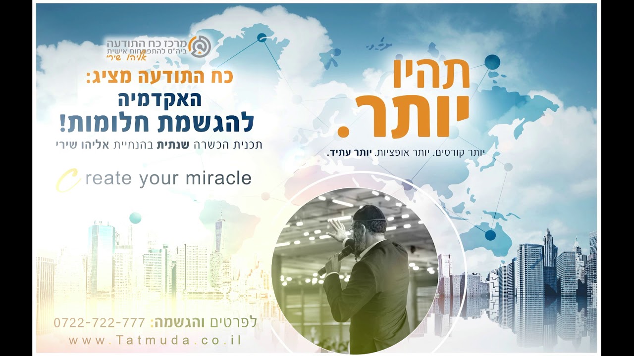 מסע משנה חיים כח התודעה הצטרפו אלינו לסדרת הסרטונים החינמית והמושקעת ב🎁 מאליהו שירי שתגלה לך מהן 3 הסודות להגשמת החלומות? לחצו על הקישור כאן 👇 http://academy.tatmuda.co.il/academy/ ------------------------------------------------------------------------------------- לפרטים על תכנית ההכשרה השנתית 🏆: http://bit.ly/2Wt97vh כבר בגיל 14 גילה אליהו את עוצמת התת מודע כשפתר בעזרת תרגילים פשוטים בעיה כרונית של בטחון עצמי ממנה סבל מילדותו. במהלך השנים רכש עוד ועוד ניסיון חיים בכלים נוספים והגיע בעזרתם לתוצאות בכל תחום שבחר, פעמיים אלוף הארץ בקרב מגע, בזמן שירותו בצנחנים אימצה החטיבה את שיטות הלימוד שלו וכיום יחידות מיוחדות בצה"ל עוברות הכשרה על פי שיטה אותה כתב אליהו בזמן שירותו. לאחר חזרתו בתשובה בזמן שעבד כאיש מכירות הפך תוך מספר חודשים לאחד מאנשי המכירות המובילים בארץ ובאירופה, ותוך זמן קצר החל לפתח שיטות הדרכה לסוכנים בחברות שיווק הגדולות והמובילות בארץ. גם כשהחל אליהו את דרכו כמאמן בסדנאות שליטה בתת מודע הפך בזמן קצר לאחד המאמנים המובילים עם ממוצע של 600 משתתפים מדי חודש בסדנאות ברחבי הארץ עם חשיפה של עשרות אלפי איש בישראל בלבד בטלוויזיה ברדיו ובאתר הבית של כח התודעה. מדי שבוע עשרות עדויות של משתתפי הסדנאות אשר ביצעו את התרגילים הלקוחים בחלקם משיטת ה NLP חלקם משיטות קאוצ'ינג קלאסי, חלקם משיטות פסיכולוגיות בשיתוף כלים ומקורות חדשניים מהקבלה והחסידות. עכשיו לראשונה ועקב מאות הדורשים טיפול אישי ולא מקבלים מענה החלטנו לפתוח את השיטה לכולם, עכשיו גם אתם יכולים להיות חלק מהמהפכה ששוברת את כל גבולות ההיגיון וההצלחה! אליהו שירי שעצמו הוכשר כמאסטר וטריינרNLP אצל וויל הורטון מהפדרציה האמריקאית ל NLP וכקאוצ'ר באוניברסיטה העברית בין שאר הדברים, החליט לנצל את הידע הכביר אשר רכש בקורסים ובהכשרות השונות מול המציאות בשטח , ויצר את קורס המאמנים המושלם אתם מוזמנים לעקוב אחרי פעילות בית הספר "כח התודעה" וכמו כן ליהנות משיעורים רבים אשר יעלו באתר בחינם כשירות לקהילה. להדרכה יומית חינמית של אליהו שירי בנושאים כריזמה, בטחון, שפע, ריפוי מחלות ועוד: http://bit.ly/2BnHFql ------------------------------------------------------------------------------------- מדי חודש מקיים מרכז כח התודעה ערב עוצמתי, בהנחיית אליהו שירי - בהשתתפות מאות אנשים רוצים להשתתף בערב כזה? חייגו 072-2722-777 או לחצו כאן להרשמה http://bit.ly/2NNnsS2 לקבלת תכנים מעצימים או מידע אודות פעילויות, קורסים וסדנאות יש לשלוח את המילה הצטרפות לקבוצת הווטסאפ למס' 0548065015. ------------------------------------------------------------------------------------- *המסע של אליהו שירי מבעיה כרונית של בטחון עצמי למנחה ומנטור באקדמיה של כח התודעה* כבר בגיל 14 גילה אליהו שירי את עוצמת התת מודע כשפתר בעזרת תרגילים פשוטים בעיה כרונית של בטחון עצמי ממנה סבל מילדותו. במהלך השנים רכש עוד ועוד ניסיון חיים בכלים נוספים והגיע בעזרתם לתוצאות בכל תחום שבחר, פעמיים אלוף הארץ בקרב מגע, בזמן שירותו בצנחנים אימצה החטיבה את שיטות הלימוד שלו וכיום יחידות מיוחדות בצה"ל עוברות הכשרה על פי שיטה אותה כתב אליהו בזמן שירותו. לאחר חזרתו בתשובה בזמן שעבד כאיש מכירות הפך תוך מספר חודשים לאחד מאנשי המכירות המובילים בארץ ובאירופה, ותוך זמן קצר החל לפתח שיטות הדרכה לסוכנים בחברות שיווק הגדולות והמובילות בארץ. גם כשהחל אליהו את דרכו כמאמן בסדנאות שליטה בתת מודע הפך בזמן קצר לאחד המאמנים המובילים עם ממוצע של 600 משתתפים מדי חודש בסדנאות ברחבי הארץ עם חשיפה של עשרות אלפי איש בישראל בלבד בטלוויזיה ברדיו ובאתר הבית של כח התודעה. מדי שבוע עשרות עדויות של משתתפי הסדנאות אשר ביצעו את התרגילים הלקוחים בחלקם משיטת ה NLP חלקם משיטות קאוצ'ינג קלאסי, חלקם משיטות פסיכולוגיות בשיתוף כלים ומקורות חדשניים מהקבלה והחסידות. עכשיו לראשונה ועקב מאות הדורשים טיפול אישי ולא מקבלים מענה החלטנו לפתוח את השיטה לכולם, עכשיו גם אתם יכולים להיות חלק מהמהפכה ששוברת 