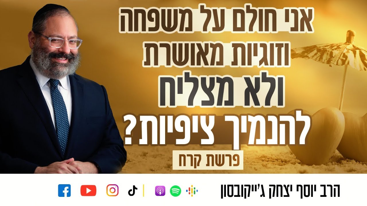 הצטרפו לקבוצת הוואטסאפ השקטה של שיעורי הרב: https://chat.whatsapp.com/BafeUZXr7w7F5076DNTYVv 'מה אתה חולם להיות כשתהיה גדול?', כך נשאלנו כשהיינו ילדים ומבחינה זו ניתן לומר שנשארנו ילדים. כל אחד מאתנו נושא עד היום חלומות ושאיפות לעתיד טוב יותר – משפחה חמה ומלוכדת, זוגיות מאושרת וצמיחה והתעלות בעבודת השם. הבעיה מתחילה כשאנחנו לא מצליחים להגשים ולהשיג את כל החלומות שלנו ואז, יחד עם תחושת ההחמצה, עולה בליבנו הייאוש והמחשבה שלעולם לא נצליח לחיות את החיים שרצינו לעצמנו וכדאי שנתחיל להנמיך ציפיות. ניתן לחיים לזרום כמו שהם ואולי 'כשנהיה גדולים' הם ייראו אחרת. סיפור המחלוקת של קרח וחבורתו על משה ואהרן מלמד אותנו שיעור מאלף בהתייחסות שצריכה להיות לנו לשאיפות שלנו ולחלומות של הסובבים אותנו. לעולם אל תתעוררו מהחלום. אסור לנו להתייאש ולהפסיק לחלום, כי החלום, גם כזה שלא מושג, משמש עבורנו כמורה דרך ומצפן לחיים. הרב יוסף יצחק ג'ייקובסון בשיעור מרתק ומאלף לפרשת קרח. רוצים לקבל עדכון כשהשיעור השבועי עולה? הירשמו כמנוי! • להרשמה לערוץ של הרב ג'ייקובסון ביוטיוב ◄https://shorturl.at/nERU1 • הרב בטוויטר ◄ https://twitter.com/RabbiYYJacobson • מוזמנים לעקוב גם בפייסבוק ◄ https://facebook.com/RYYJacobson • באינסטגרם ◄ https://www.instagram.com/rabbi.jacobson • בטיקטוק ◄ https://www.tiktok.com/@rabbi_jacobson • לאתר האינטרנט ◄ https://lilmod.net ניתן להאזין לשיעור גם באפליקציות הפודקאסטים • אפל ◄ https://podcasts.apple.com/podcast/id1606711932?mt=2&app=podcast&ls=1 • ספוטיפיי ◄ https://open.spotify.com/show/33Ya3zsURYhdwkiWRpohkb • גוגל פודקאסט ◄ https://podcasts.google.com/feed/aHR0cHM6Ly9ybmFjaG1hbnNvbi5jYXB0aXZhdGUuZm0vcnNzZmVlZA #הרב_גייקובסון #פרשת_קרח #הגשמת_חלומות