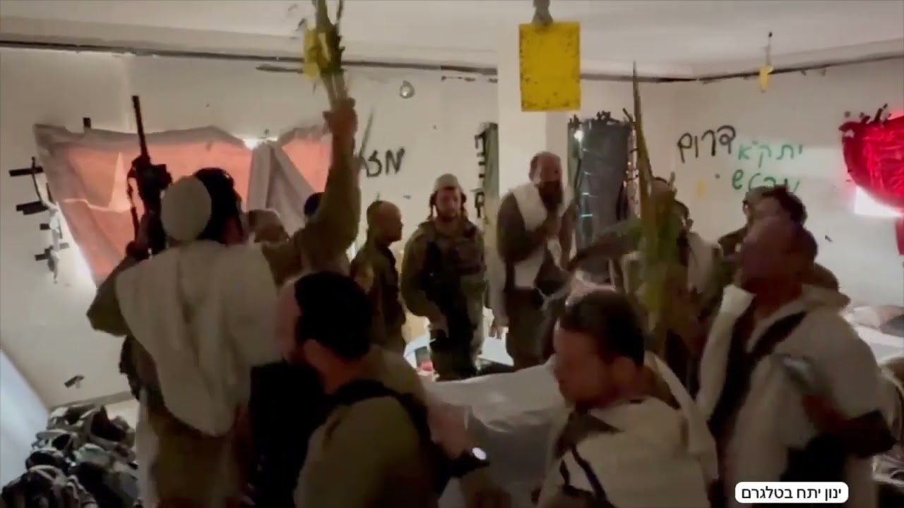 לוחמים חוגגים בתפילת שחרית של חול המועד סוכות - מתוך מגנן בלב רצועת עזה.