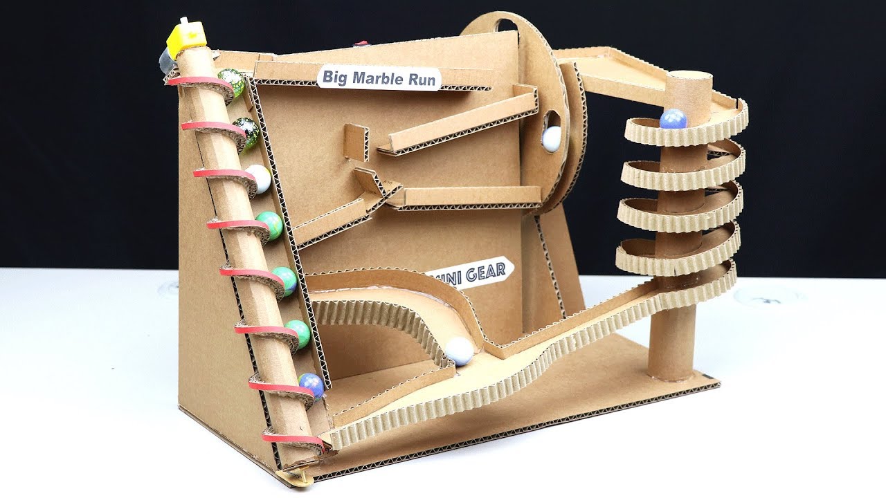 How to make big marble run machine from cardboard. You can make this project at home with your friends. It's so fun and I really love this marble run machine. I hope everyone like this idea. Thank you so much for watching!! Please subscribe to get more interesting videos: https://www.youtube.com/channel/UCNZMEiM-ZMYmEk2CG3mr1_Q?sub_confirmation=1 You Need: - DC motor - Speed controller DC motor - 9v battery - BBQ bamboo sticks - Electric wire and battery connector wire - Ice-cream sticks - Switch - Cardboard Cardboard Measurement: ==================== (cm = centimeter) 1,5cm x 8,5cm = 1 piece 1,5cm x 16cm = 1 piece 1,5cm x 22cm = 1 piece 1,5cm x 25cm = 1 piece 2cm x 3cm = 1 piece 3cm x 2,5cm = 1 piece 3cm x 3cm = 1 piece 3cm x 4cm = 1 piece 3cm x 9cm = 1 piece 3cm x 18,5cm = 1 piece 3cm x 19cm = 1 piece 3cm x 25cm = 1 piece 6cm x 33cm = 1 piece 10cm x 35cm = 1 piece 14cm x 28cm = 1 piece 18cm x 30cm = 1 piece 20cm x 45cm = 1 piece 30cm x 30cm = 1 piece