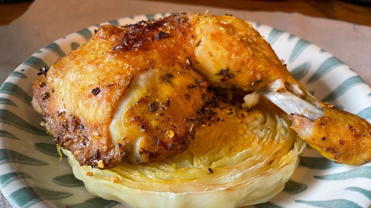 להניח את פרוסות הכרוב על מגש אפיה. לתבל את הכרוב, להניח עליו את חתיכות העוף. לצלות בתנור על 180 מעלות במשך שעה אחת. בסוף אפשר להגביר את החום למשך דקות מספר כדי ליצור צבע יפה.