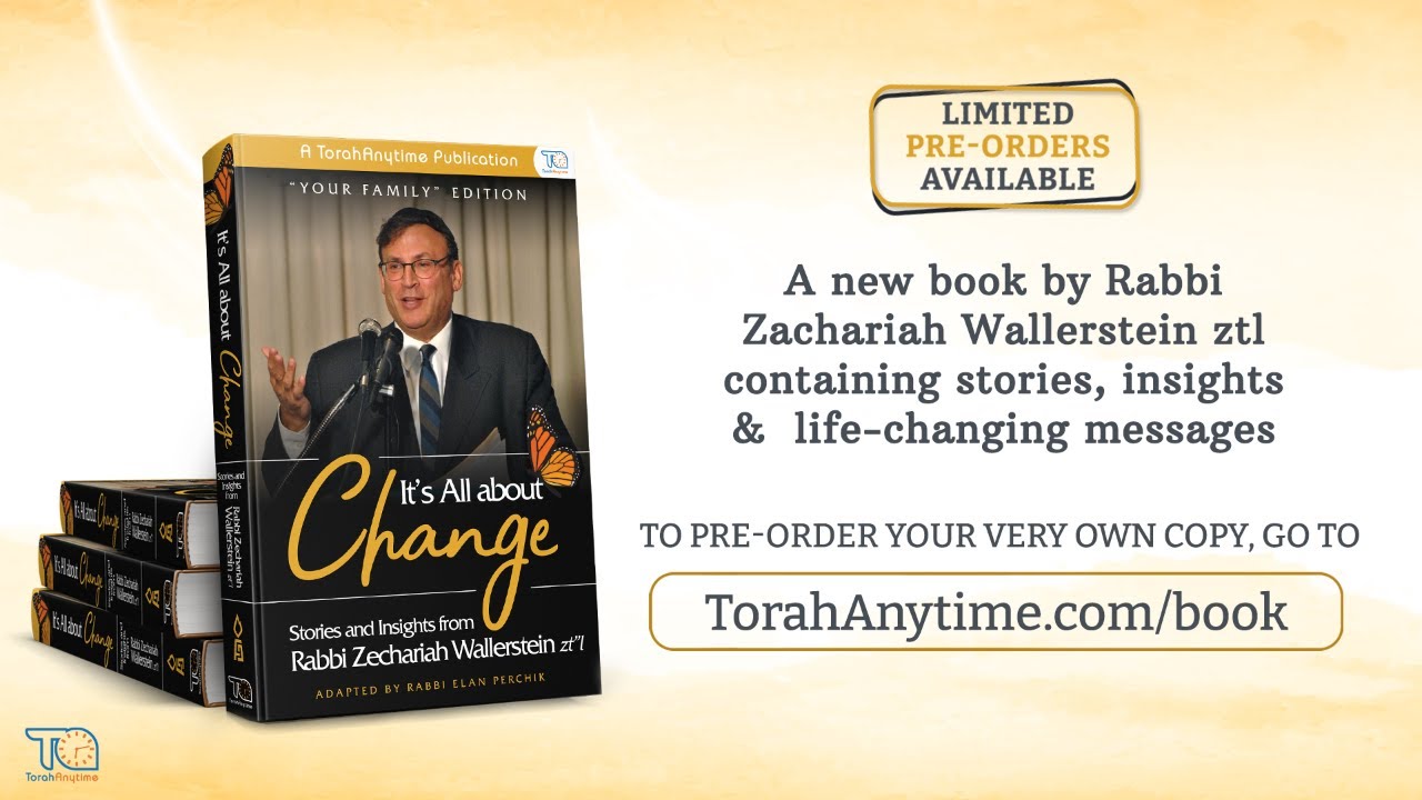 "It's All About Change" Pre-Order your copies today https://shop.torahanytime.com In It's All About Change, Rabbi #ZechariahWallerstein, the visionary behind Ohr Naava, Ateres Naava, Bnot Chaya Academy, the Ranch at Bethel and a host of other programs and initiatives - will guide you through a meaningful and refreshing Jewish life and touch your heart and ignite your soul. Drawn from Rabbi Wallerstein’s hundreds of classes on #TorahAnytime, dozens of stories and insights fill these pages. Whenever Rabbi Wallerstein wondered if he could take on another project or endeavor, he reminded himself of what his father would say: "If your plate is full, get a bigger plate." It's All About Change will inspire you just the same. Never stop. Never stop helping others, never stop accomplishing, never stop feeling that Hashem is always by your side, and never stop believing in yourself and in others. It's wisdom for every age, for every walk of Jewish life, for every man, woman and child who strives to become greater. “It’s all about change” stands as the iconic signature of Rabbi Wallerstein and the driving force of Ohr Naava. It’s all about changing and growing. With each turn of a page, no doubt, you’ll be accomplishing just that.