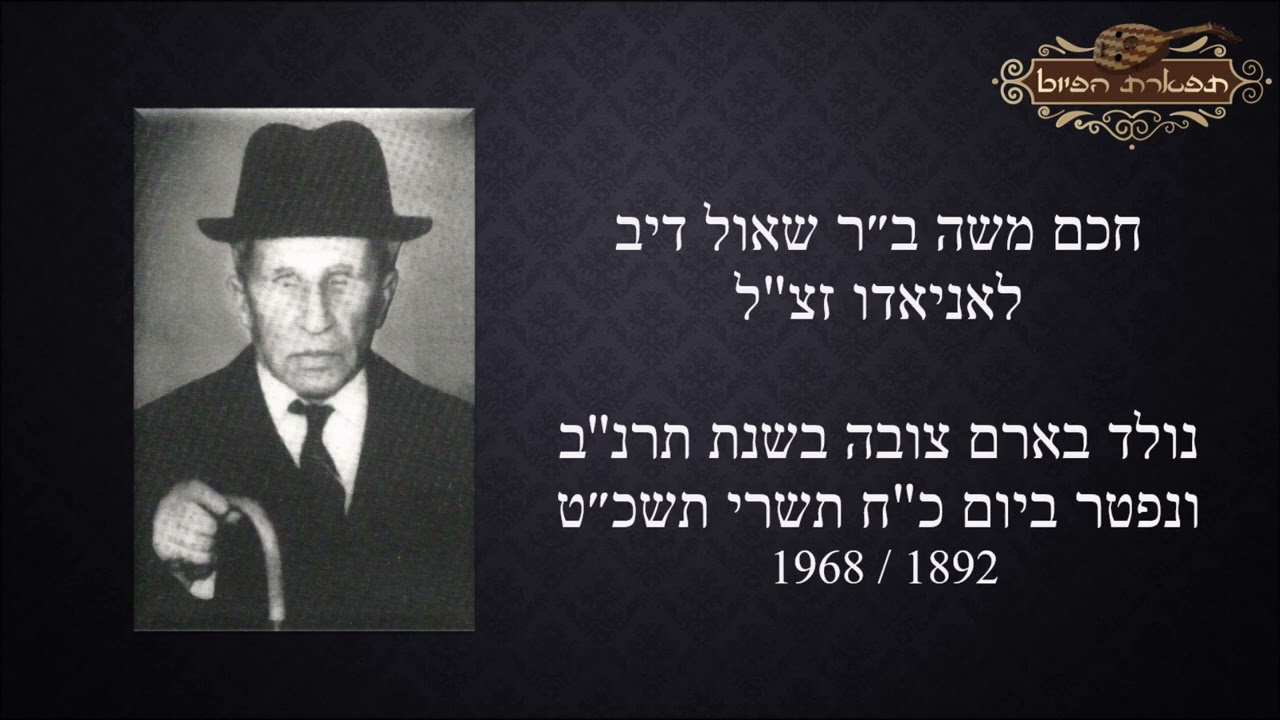 חכם משה ב״ר שאול דיב לניאדו זצ"ל נולד באר׳ץ בשנת תרנ׳׳ב. מצד אמו הוא נכד לרבי משה הררי. בגיל חמש חלה בעיניו ומאז ניטל מאור עיניו. למרות אבדן ראייתו ישב ולמד בת׳ ת ככל הילדים בגילו. למד תלמוד מפי רבי עזרא שעיר (הנד באות תק״ב). בשקידתו בלימודיו השתוה לחבריו, עד שהיה לאחד הבקיאים והמעמיקים בש״ס ופוסקים ובספרי השו״ת. הוא עשה לילות כימים בלימוד התורה. היה בין ראשוני הבאים לביהכ"נ המשכימים קום מחצות לילה. לרוב היה לו ת־ח חבר שישב לידו והשמיע לו ש״ס, פוסקים ושו־ת. לרבי משה, היו נהירין השבילים, בכל מקצוע ובכל תחום, דבר לא נעלם ממנו, רבים השכימו לפתחו לשאול ולשמוע בעצתו, אם בעניני משא ומתן או מקח וממכר של מטלטלין או מקרקעין. בשנת תרפ"ת מונה ע־י ביה־ ד על רכוש ההקדש של חכמי ורבני קהילת אר״ץ. וגם ממונה על ביהכנ״ס מדרש ״בית נשיא״. כאשר, בשנת תש"ח שרפו פורעים ערביים, את ביהכ"נ, דאג הוא לשיפוצו ותיקונו מחדש. חריפותו ושנינותו של רבי משה היו לשם דבר, היה טוען ומייצג בעלי דינים בפני ביה"ד בבקיאות ובחריפות מיוחדת. רבי משה, היה נעים זמירות ישראל ומשמח אלקים ואנשים, בקולו הנעים והערב, ידע למעלה מאלף פזמונים ושירי קדש בע"פ. בשנת תשכ״ב עלה ארצה והתגורר בת"א. שם נהג יום יום ללכת לביהמ״ד "חן מרדכי" לשמוע תורה מפי רבי משה טוויל. בתשכ״ז נפל למשכב וסבל ייסורין קשים כשנה וחצי. ביום כ"ח תשרי תשכ״ט השיב את נשמתו הטהורה לבוראה. הובא למנוחות עולמים בבית העלמין בחולון. חבר יקר! הירשם כמנוי לערוץ תפארת הפיוט הפעל את האפשרות 'כל ההתראות' (לחץ על הפעמן בצד שמאל) בדף הראשי תהנה ותתעדכן ממיגוון סירטונים בעולם הפיוט. לחץ על הקישור הבא.. https://www.youtube.com/user/sha91031