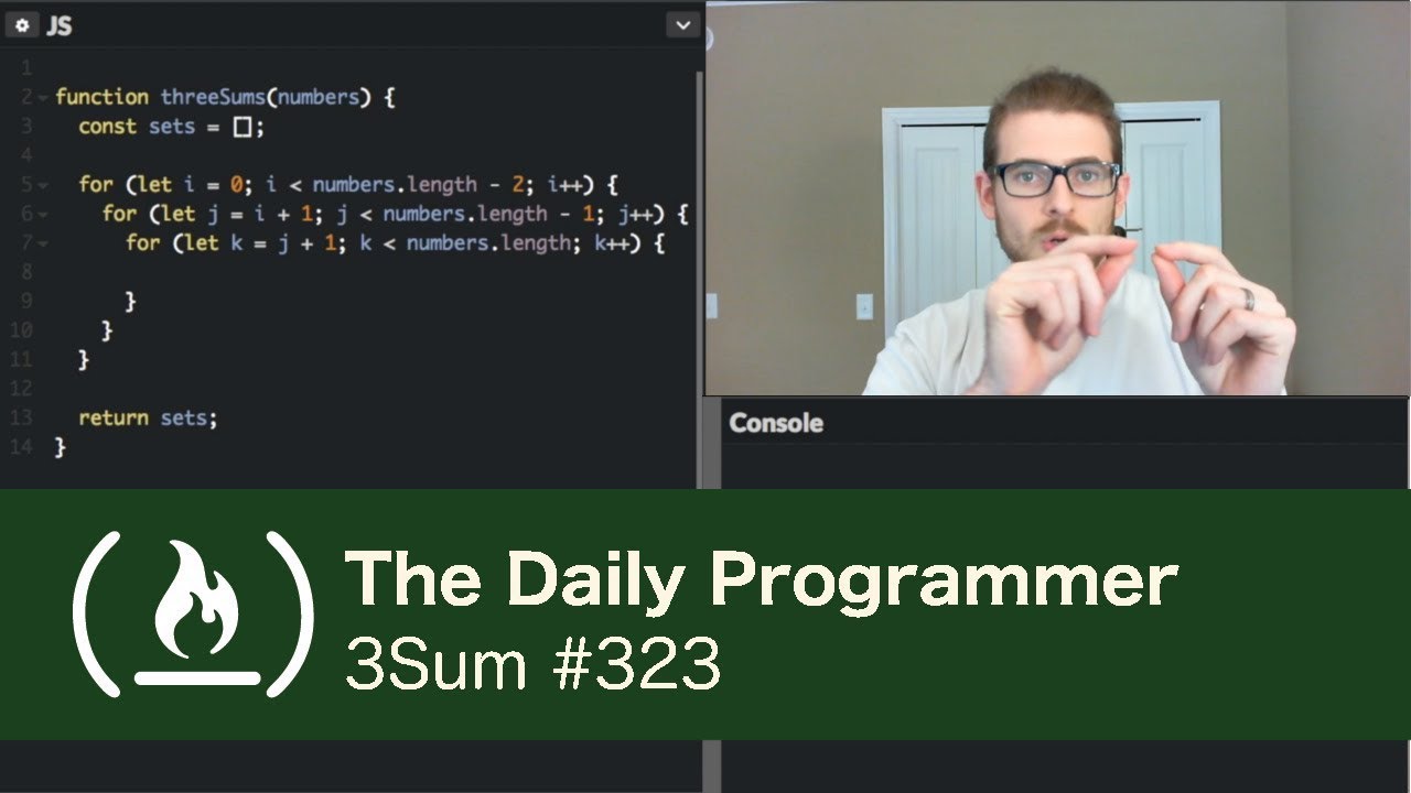 The 3SUM problem we are discussing was found here: https://www.reddit.com/r/dailyprogrammer/comments/6melen/20170710_challenge_323_easy_3sum/ Follow me on twitter: https://twitter.com/CodyLSeibert Help us improve our videos by taking this short survey here: https://goo.gl/forms/rustp398xzDYRZoI3 Feel free to post links to your own solutions to this problem in the comments! I'm still working out the best audio / mic setup, so bear with me if the audio seems too loud in some places or sounds different between videos. Learn to code for free and get a developer job: https://www.freecodecamp.com Read hundreds of articles on programming: https://medium.freecodecamp.com ❤️ Support for this channel comes from our friends at Scrimba – the coding platform that's reinvented interactive learning: https://scrimba.com/freecodecamp