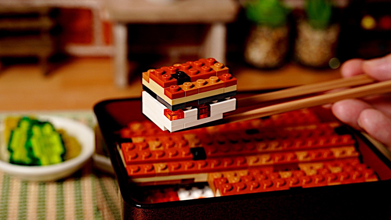 Hello I'm tomosteen. This video shows how to make “Unaju”, a traditional Japanese dish, with LEGO. Unaju” is a dish made of rice in a lacquered box, topped with broiled eel. This video is a stop-motion animation created with many pictures. Thanks for watching my video, have a nice day!