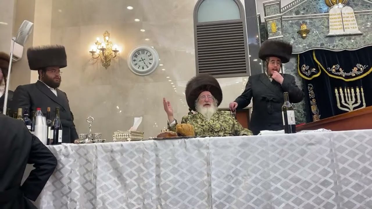טיש משתה היין מוצאי פורים דפרזים בחצר הקודש ספינקא, פורים תשפ״ג
