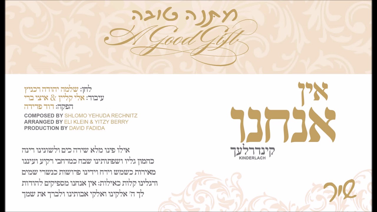 האלבום 'מתנה טובה' מלחניו של ר' שלמה יהודה רכניץ, יוצא לרגל שמחת נישואי בתו חנה עב"ל נפתלי שוסס הי"ו. באלבום 12 לחנים חדשים, ומשתתפים בו הזמרים: אברהם פריד, אוהד מושקוביץ, משה מנדלוביץ, איציק דדיה, שלוימי דסקל, בני פרידמן, ברוך לוין, ברי וובר, שמחה ליינר, קינדרלעך, משה טישלר, הילד א.ח. גרין וקהלת שירה. הפקה: דוד פדידה עיבודים: אלי קליין & איצי ברי אילו פינו מלא שירה כים ולשונינו רינה כהמון גליו ושפתותינו שבח כמרחבי רקיע ועינינו מאירות כשמש וירח וידינו פרושות כנשרי שמים ורגלינו קלות כאיילות: אין אנחנו מספיקים להודות לך ה' אלקינו ואלקי אבותינו ולברך את שמך Toward the beginning of the tefillah of Nishmas, we declare, “Ilu finu malei shirah ka’yam, u’lshoneinu rinah ka’hamon galav, ve’sifsoseinu shevach ke’merchavei rakia … ein anachnu maspikim le’hodos lecha Hashem… u'levarech es Shemecha— Were our mouths as full of song as the sea, and our tongues as full of joyous song as its multitude of waves, and our lips as full of praise as the breadth of the heavens… we still could not thank You sufficiently, Hashem.” Rav Baruch of Mezhibuzh gives a beautiful insight. The first portion of Nishmas uses the suffix “nu,” meaning ours. Our mouths. Our tongues. Our lips. This implies that the power lies within us, that we are the ones who control our destiny. Therefore, “Ein anachnu maspikim le’hodos lecha Hashem — We still could not thank You sufficiently, Hashem.” If we attribute our capabilities to ourselves, and fall into the trap of assuming that our victories and achievements are due to our innate skills, then we are unable to even begin thanking Hashem. There are times when we celebrate a momentous occasion, and it is easy for us to take the credit. We may mistakenly feel that it is our intellect, our effort, our hard work, and our talents that have brought us to this moment. But we must never forget that it is Hashem Who controls everything, down to the last breath we take. Hence, all our accomplishments have nothing to do with our capabilities, but they are only due to Hashem’s kindness. We can step forward and use those gifts Hashem has bestowed upon us to do what we are meant to do — bring praise to Hashem. And this is the beauty of the prayer of Nishmas.