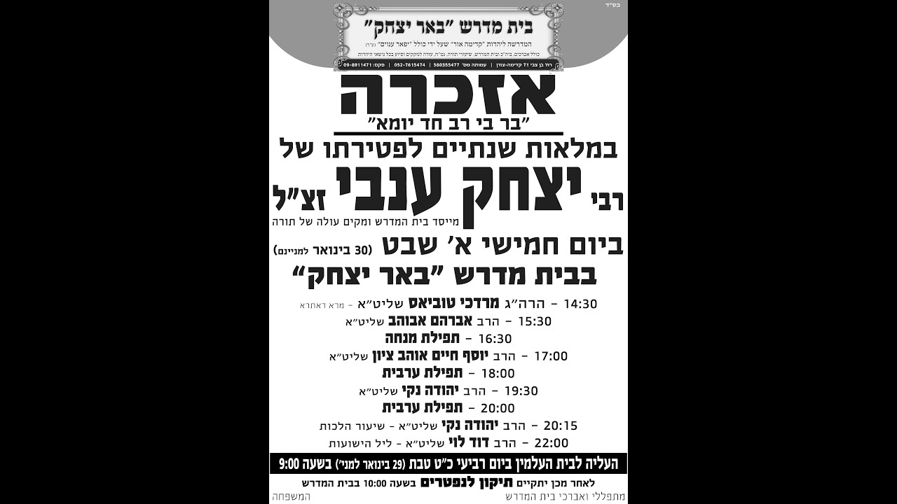 ttps://www.youtube.com/@beer-itzhak אזכרה יצחק ענבי ז"ל מקים עולה של תורה - בישוב קדימה והסביבה בלאות שנתיים לפטירתו יועבר שיעורים מפי הרבנים שליט"א הרב מורדכי טוביאס הרב אברהם אבוהם והרב אוהב ציון "חדש!!! עכשיו גם אפליקציה במכשירי אנדורייד " באר יצחק עקבו אחרינו ושתפו חברים לצפייה במגוון שיעורים מפי מיטב הרבנים שיעורים מתקיים בכל יום מהשעה 19:00-20:00 & 20:15-21:45 בבית המדרש באר יצחק - קדימה רח' בן צבי 71 https://beer-itzhak.co.il/
