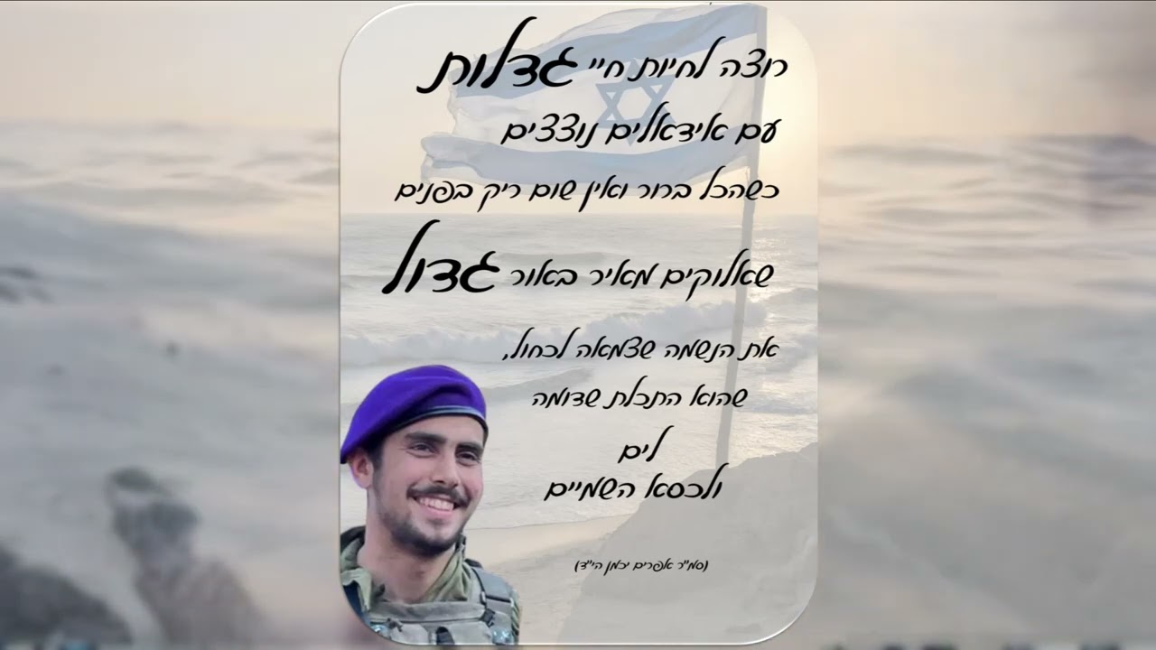 "רוצה לחיות חיי גדלות, עם אידיאלים נוצצים...שאלוקים מאיר באור גדול את הנשמה שצמאה לכחול שהוא התכלת, שדומה לים ולכסא השמיים" מילים: מתוך יומנו של סמ"ר אפרים יכמן הי"ד מנווה דניאל, תלמיד ישיבת ירוחם, שנפל בגבורה בעזה בט"ו בטבת תשפ"ד לחן: דוד סילברברג ביצוע והפקה: אורי ויזל תודה מיוחדת: חנה לאה סילברברג Lyrics: from the diary of Efraim Jackman Hy"d Composed by David Silverberg Sung & produced by Ori Vizel Special thanks: Chana Leah Silverberg יהי רצון שנזכה תמיד ללכת לאורו הגדול של אפרים, לשאוף לחיים של גדלות וקרבת אלוקים. דוד סילברברג, אלון שבות davidavrahamsilverberg@gmail.com