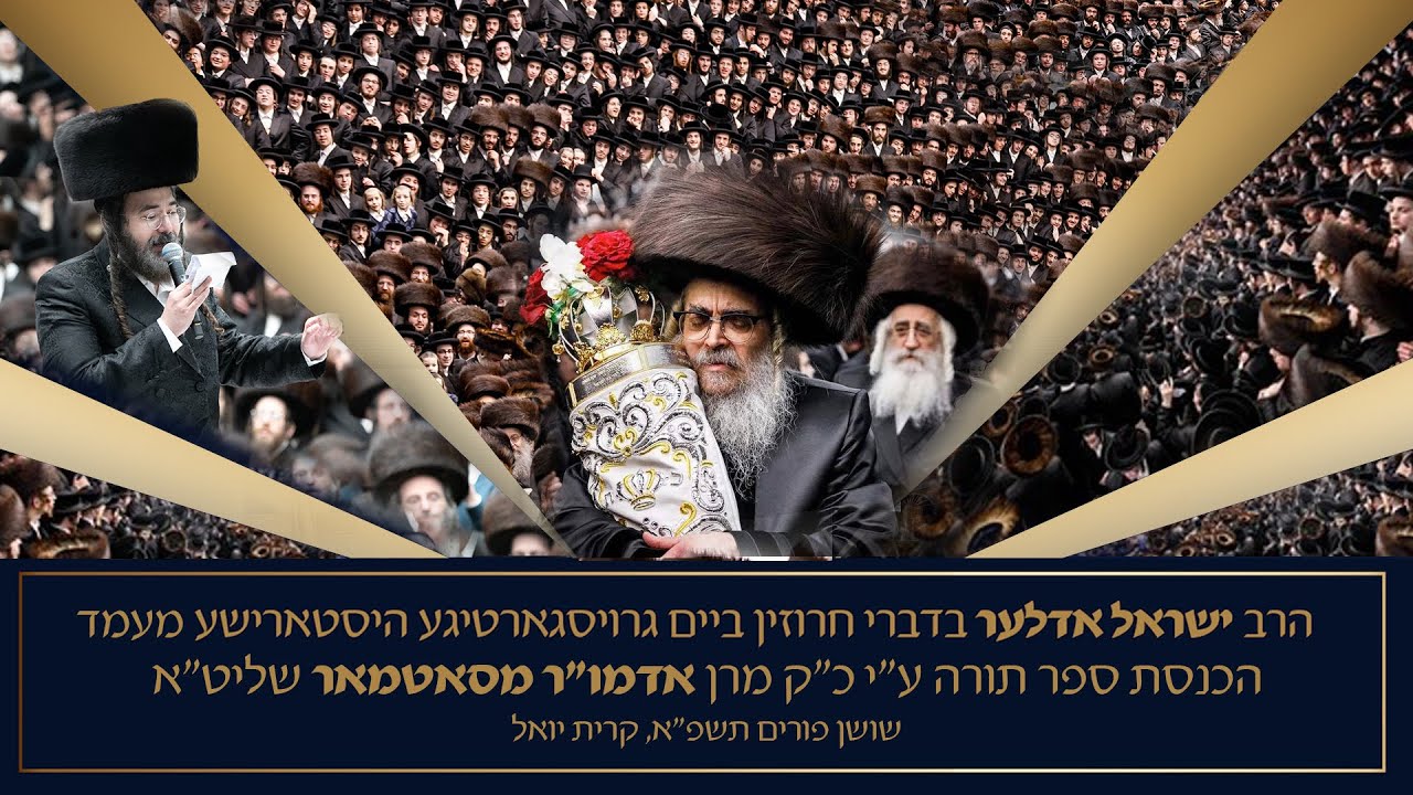 הרב ישראל אדלר בדברי חרוזין במעמד ההיסטורי של הכנסת ספר תורה ע"י כ"ק מרן אדמו"ר מסאטמאר שליט"א, שושן פורים תשפ"א, קרית יואל. לרגל חג שמחת תורה הקרב ובא, מוגש לציבור חובבי הז'אנר - הקלטה מהגראמען שכתב ושר ישראל אדלר - שהובא במיוחד מארץ הקודש, לפאר ולרומם את המעמד ההיסטורי שטרם נראה כמותו בחצר הקודש סאטמער: מעמד הכנסת ספר תורה אותו הכניס כ"ק האדמו"ר מסאטמאר שליט"א, בשושן פורים תשפ"א. תמונות שער: יוסי גולדברגר, הלל ל"ש ושאט די דאט
