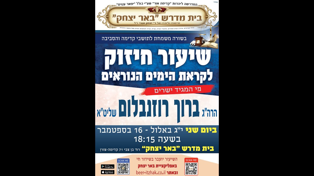 https://www.youtube.com/@beer-itzhak "חדש!!! עכשיו גם אפליקציה במכשירי אנדורייד " באר יצחק עקבו אחרינו ושתפו חברים לצפייה במגוון שיעורים מפי מיטב הרבנים שיעורים מתקיים בכל יום מהשעה 19:00-20:00 & 20:15-21:45 בבית המדרש באר יצחק - קדימה רח' בן צבי 71 https://beer-itzhak.co.il/