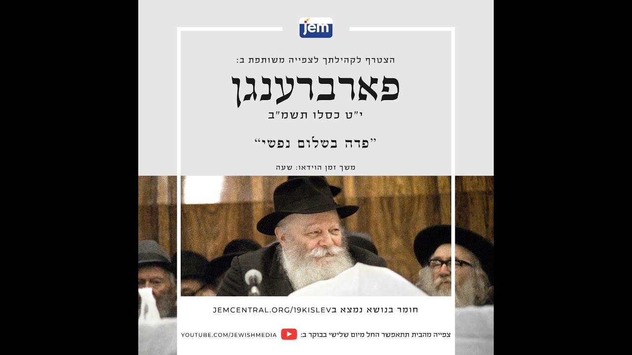 י"ט כסלו הוא יום שחרור אדמו"ר הזקן, מייסד תנועת חב"ד ממאסרו בכלא הרוסי, יום זה, הנקרא בפי חסידים 'ראש השנה לחסידות' מציין פריצת דרך חדשה בהפצת תורת החסידות לעולם כולו. בשנת תשמ"ב, בהתוועדות שערך לכבוד יום י"ט בכסלו התייחס הרבי למכתב מיוחד שכתב אדמו"ר הזקן ומוען לחסידיו השמחים בשחרורו. במכתב עסק אדמו"ר הזקן בגדולתו וחשיבותו של השלום והשמירה עליו. מדוע בחר אדמו"ר הזקן להתמקד בנושא זה ולהתעלם מנושאים נוספים וחשובים אחרים? שאל הרבי, כיצד על יהודי לנצל את הכוחות שניתנו לו מהקדוש ברוך הוא, ומה הלימוד המיוחד בהקשר זה לי"ט כסלו? את התשובות לשאלות הללו נתן הרבי בשיחה המיוחדת הזו שתורגמה לעברית והיא תוקרן ביום שני י"ח כסלו בשעה 19:00. הצטרפו גם אתם לאלפי חסידי חב"ד ברחבי העולם, בצפייה ולימוד שיחה ייחודית זו. http://jem.co.il
