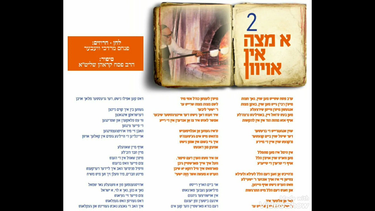 ערב פסח שטייט מען שוין, נאך חצות מיט׳ן רבי׳ן גייט מען שוין, באקן מצות אנגעטון מיט׳ן ווייסן שירצעלע מען בעט ס׳זאל זיין, באוויליגט נרצה׳לע אויף אזא מחזה הוד אין אין להקשות שוין אנגעגרייט די ברעטער דער שיסל שוין ביים קנעטער מ׳קנעט שוין איין די מיירע אין הימל איז מען מתפלל מען ווארט שוין אויפ׳ן הלל אויף די טרערן די טייערע מ׳הייבט אן זאגן דעם הלל לעילא ולעילא צווישן זיי איז אויך אונזער ר׳ ישעי׳לע וואס הערט נישט אויף צו וויינען, און זאגט דעם הלל מיט התרגשות גאר אַן אלטער איד ר׳ ישעי׳ ביים אויוון שטייט ער מיט׳ן לעצטן כח׳ל אזוי מיד לשם מצות מצוה שרייט ער ר׳ ישעי׳ ליבער איר זענט דאך נישט דער איינציגסטער שיבער אפשר לאזט איר צו אַן אנדערן אין די רייע ס׳איז געווען אַן אנלויפעניש מ׳האט מיט אים גע׳טענה׳ט איך גיי בשום אין אופן נישט אוועק פון דאנעט אז איר וועט הערן דעם סיפור, וועל איך אייך פארשטיין גיבן פארוואס איך וויל דוקא יא שיבן הערט א מעשה אשר חָזָה ישעי׳ אוי ביים הארץ רייסט מיליאנען נעבעך פארגאזט אין אוישוויצער גיהנום אינעם ביטערן זמן יענעם דעם בורא פארשטיין ווער קען אים דאס קען אפילו נישט, דער גרעסטער מלאך אויבן געווען בין איך קוים ניינצן דערשראקן אינגאנצן ווי עס פלאקערן און שפרינגען די פייער צינגען האבן זיי מיר ארויפגעצווינגען אריינלייגן די הייליגע גופים אין קאלעך אויוון אויף מיין שאוועלע מיין חבר דוב׳לע מיט׳ן שאוול אין די הענט צום פייער וואס ברענט וויפיל פנימ׳ער האב איך ליידער דערקענט מיינע חברים, מיר וועלן זיך זען מיט משיח ארויסגענומען פון א וועגעלע גאר שמאל נאך א כהן, נאך א לוי, א ישראל צום פייער זיי געיאגט דאס געוויסן האט געפלאגט איך האב די גאנצע נאכט געוויינט און געקלאגט און געזאגט טאטע פארוואס פונקט איך א אידעלע אין אויוון אריין אוי נקום נקמת דם נאך א אידעלע אין אויוון אריין א מאמע מיט איר קינד צוזאם וויי און ווינד, צו אזעלכע אויגן וואס האבן געזען וואס איך האב געזען צי וועט די וועלט, נאך זיין באוואויגן און גלייבן דאס איז אמאל געשען אוי, מי יודע א אידעלע אין אויוון אריין אוי נקום נקמת דם נאך א אידעלע אין אויוון אריין אוועק מיט׳ן פלאם וויי און ביטער, אזא שאנד צו אזעלכע הענט וואס האבן דאס געקענט טון וויאזוי האסטו נישט מורא געהאט, מיין האנט וואס וועסטו ענטפערן ביים יום הדין אוי, שרייט זיך דארט ר׳ ישעי׳ כהן לוי, כהן לוי ישראל אוי געוואלד, אוי געוואלד, טאטע זיי מיר מוחל אוי געוואלד, אוי געוואלד, יודעלעך זייט מיר מוחל מיין הארץ טוט מיר פאר ענק אלע וויי איך וואלט זיך געטוישט מיט ענק, הלוואי איך וויל כאטש מיט ענק מיטגיין, די הויכע עולמות כהן לוי, כהן לוי ישראל אוי געוואלד, אוי געוואלד, טאטע זיי מיר מוחל אוי געוואלד, אוי געוואלד יודעלעך זייט מיר מוחל דם עבדיך השפוך מיט די זכרונות גיי איך און שלאף איך איך וועל קיינמאל פארגעסן פון ענק, הייליגע נשמות יעצט פארשטייט איר שוין אליין פארוואס ביים אויוון וויל איך דווקא שטיין יעדער האט זיין תיקון ביז׳ן טאג דעם היינטיגן טראכט איך וואס קען זיין מיין תיקון איך קוק ארויף צום קל טוב וסלח אויבן ווען איך שטיי נאכאמאל ביים הייסן אויוון באקן מצות פאר די הייליגע ימים טובים איר האט אלע געזען אין מיר וויפיל טרערן איז געווען אין מיר ווייל איך זעה נישט מצות נאר פנימ׳ער זאלן די טרערן מכפר זיין, אויפ׳ן קאלעך אויוון א מצה אין אויוון אריין, לשם מצות מצוה נאך א מצה אין אויוון אריין, לשם מצות מצוה מתרצה ברחמים, אוי מתרצה ומתפייס בתחנונים זאל זיין א כפרה פאר מיר יעדע מצה כ׳האב געמוזט אויספירן אזעלכע דינים אוי, מיט טרערן איך קלאג א מצה אין אויוון אריין, לשם מצות מצוה נאך א מצה אין אויוון אריין, לשם מצות מצוה הייליגער טאטע, פאר מיר פארציי ווען איך שטיי, ביים אויוון די הייסע און איך בעט מיך איבער מיט זיי ונקיתי דמם לא נקיתי אוי, מיט א קרעכץ איך זאג מיין כהן, מיין לוי, מיי