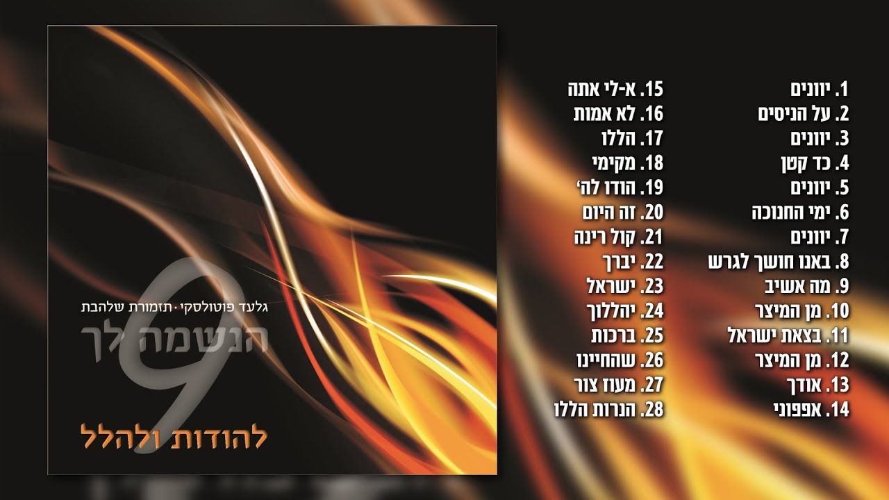 גלעד פוטולסקי ותזמורת שלהבת - Gilad Potolsky & Shalhevet Orchestra Haneshama Lach 9 1,3,5,7. יוונים - Yevanim Nikbetzu Alai יוונים נקבצו עלי, אזי בימי חשמנים, ופרצו חומות מגדלי, וטימאו כל השמנים. ומנותר קנקנים, נעשה נס לשושנים, בני בינה ימי שמונה, קבעו שיר ורננים. 2. על הניסים - Al Hanisim על הניסים ועל הפורקן ועל הגבורות ועל התשועות ועל המלחמות שעשית לאבותינו בימים ההם בזמן הזה. 4. כד קטן - Kad Katan כד קטן, כד קטן, שמונה ימים שמנו נתן. כל העם התפלא, מאליו הוא מתמלא. כל העם אז התכנס והכריז, אך זהו נס. אילולא כד זה נשאר מקדשנו לא הואר. גם כל ילד, ילד קט יעמוד כזה הקט. ומלב תמים, טהור לעולם ישפיע אור. 6. ימי החנוכה - Yemei HaHanukkah ימי החנוכה, חנוכת מקדשנו, בגיל ובשמחה ממלאים את ליבנו, לילה ויום סביבונינו יסוב, סופגניות נאכל בם לרוב. האירו, הדליקו נרות חנוכה רבים,על הניסים ועל הנפלאות אשר חוללו המכבים. ניצחון המכבים נספר, נזמרה, על האויבים אז ידם כי גברה ירושלים שבה לתחיה, עם ישראל עשה תושיה. האירו, הדליקו... ירושלים לנו הבירה, לב ישראל שירו לה שירה. 8. באנו חושך לגרש - Banu Choshech Legaresh באנו חושך לגרש, בידינו אור ואש. כל אחד הוא אור קטן, וכולנו אור איתן. סורה חושך, הלאה שחור. סורה מפני האור. ציל-ציל-ציל בפעמונים, מי אנחנו, סביבונים. לנו רגל אחת, אם ניפול גם לא נפחד. אנו שובבים גדולים, עליזים והוללים, אך נדע יפה מאוד, לספר, לשיר, לרקוד. 9. מה אשיב - Ma Ashiv La'ashem מה אשיב לה' כל תגמולוהי עלי, כוס ישועות אשא ובשם ה' אקרא, נדרי לה' אשלם נגדה נא לכל עמו, יקר בעיני ה' המותה לחסידיו, אנה ה' כי אני עבדך, אני עבדך בן אמתך פתחת למוסרי, לך אזבח זבח תודה ובשם ה' אקרא, נדרי לה' אשלם נגדה נא לכל עמו בחצרות בית ה' בתוככי ירושלים הללויה. 10,12. מן המיצר - Min Hametzar מן המיצר קראתי קה, ענני במרחב קה. 11. בצאת ישראל - Betzet Yisrael Mimitzrayim בצאת ישראל ממצרים בית יעקב מעם לועז היתה יהודה לקדשו ישראל ממשלותיו הים ראה וינס הירדן יסב לאחור ההרים רקדו כאילים גבעות כבני צאן מה לך הים כי תנוס הירדן תיסוב לאחור ההרים תרקדו כאילים גבעות כבני צאן מלפני אדון חולי ארץ מלפני א-לו-ה יעקב ההפכי הצור אגם מים חלמיש למעיינו מים. 13. אודך - Odcha Ki Anitani אודך כי עניתני ותהי לי לישועה. אבן מאסו הבונים היתה לראש פינה. מאת השם היתה זאת היא ניפלאת בעינינו. זה היום עשה השם נגילה ונשמחה בו. 14. אפפוני - Afafuni Khevlei Mavet אפפוני חבלי מות ומצרי שאול מצאוני צרה ויגון אמצא ובשם השם אקרא אנא השם מלטה נפשי חנון השם וצדיק. 15. א-לי אתה - Keili Atah V'odekah א-לי אתה ואודך אלוקי ארוממך. 16. לא אמות - Lo Amut Ki-ehyeh לא אמות כי אחיה ואספר מעשי קה יסר יסרני קה ולמות לא נתנני, פיתחו לי שערי צדק, אבוא בם אודה קה זה השער לה' צדיקים יבואו בו. 17. הללו - Halelu Et Hashem kol Goyim הללו את השם כל גוים שבחוהו כל האומים, כי גבר עלינו חסדו ואמת השם לעולם הללוי-ה. 18. מקימי - Mekimi Meafar Dal מקימי מעפר דל. 19. הודו לה' - Hodu lashem Ki Tov הודו להשם כי טוב כי לעולם חסדו. יאמר נא ישראל כי לעולם חסדו. יאמרו נא בית אהרן כי לעולם חסדו. יאמרו נא יראי השם כי לעולם חסדו. 20. זה היום - Ze Hayom Asa Hashem זה היום עשה השם נגילה ונשמחה בו אנא השם הושיעה נא, אנא השם הצליחה נא. 21. קול רינה - Kol Rina Vishua קול רינה וישועה באהלי צדיקים ימין ה' עושה חיל ימין ה' רוממה. 22. יברך - Y'voreich et beit Yisrael יברך את בית ישראל, יברך את בית אהרן, יברך יראי ה', הקטנים עם הגדוליםץ יסף ה' עליכם, עליכם ועל בניכם, ברוכים אתם לה', עושה שמים וארץ. השמים שמים לה', והארץ נתן לבני אדם. לא המתים יהללו קה, ולא כל יורדי דומה, ואנחנו נברך קה, מעתה ועד עולם הללוי-ה. 23. ישראל - Israel Betach BaShem ישראל בטח בהשם עזרם ומגינם הוא. 24. יהללוך - Yealelucha יהללוך ה' אלוקינו על כל מעשיך, וחסידיך צדיקים עושי רצונך, וכל עמך בית ישראל ברנה יודו ויברכו וישבחו ויפארו וירוממו ויעריצו ויקדישו וימליכו את שמך מלכנו,כי לך טוב להודות ולשמך נאה לזמר, כי מעולם ועד עולם אתה אל. 25. ברכות - Brachot Hadlakat Nerot Chanukah ברוך אתה ה' אלוקינו מלך העולם אשר קדשנו במצוותיו וציו