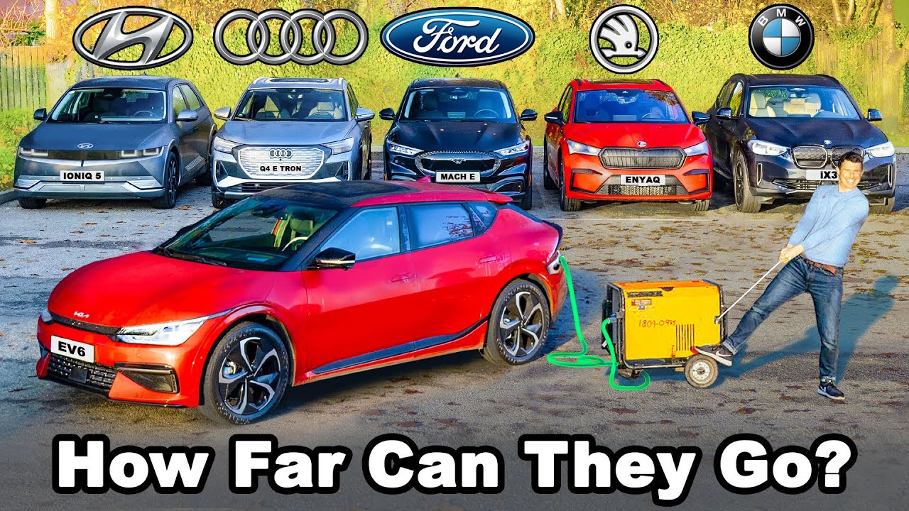 Need help buying your next car? Click the following link and my team and I will help you choose your ideal car at a fair price - from Mat Watson! http://bit.ly/-Help-Me-carwow ............................................................. It’s time for another awesome EV range test! We’ve pulled together six of the latest & greatest all-electric cars to drive them straight North from London to see just how accurate their claimed ranges are. But we won't be stopping when the range hits 0... We'll keep driving them until they come to a complete standstill, to see just what happens! So what do we have in the line-up? Well, we’ve gone for range-topping editions of all cars, apart from the first car Mat’s in - the Mustang Mach-E. Sadly, we could only get our hands on the entry-level version for this video. However, everything else in the line-up is top-of-the-range! And what a line-up it is... Audi Q4 e-tron Skoda Enyaq BMW iX3 Hyundai IONIQ 5 Kia EV6 So which do you think will go the furthest? You’ll have to keep watching to find out! ............................................................ Audi Q4 e-tron review - https://bit.ly/Audi-Q4-e-tron-Review-2022 Hyundai IONIQ 5 review - https://bit.ly/Hyundai-IONIQ-5-Review-2022 Mat's pick from this video's line-up - https://bit.ly/Mats-EV-Choice-2312 Our first EV range test - https://youtu.be/ZH7V2tU3iFc ............................................................. Instagram – http://www.instagram.com/carwow Tiktok - https://www.tiktok.com/@carwow Facebook – http://www.facebook.com/carwowuk Twitter – http://www.twitter.com/carwowuk Sign Up to our Newsletter – http://bit.ly/carwow-Newsletter Awkward haggling is a thing of the past with carwow. Choose your perfect car with our configurator tool and let the country’s best dealers compete over you. Compare the five best offers by price, location and dealer ratings and choose the one that’s right for you – no hassle, no haggling, just a great deal. Oder auch in Deutschland Geld beim Autokauf sparen – http://bit.ly/carwow-DE Visita nuestra página web para saber cuánto te puedes ahorrar en tu nuevo coche – http://bit.ly/carwow-ES