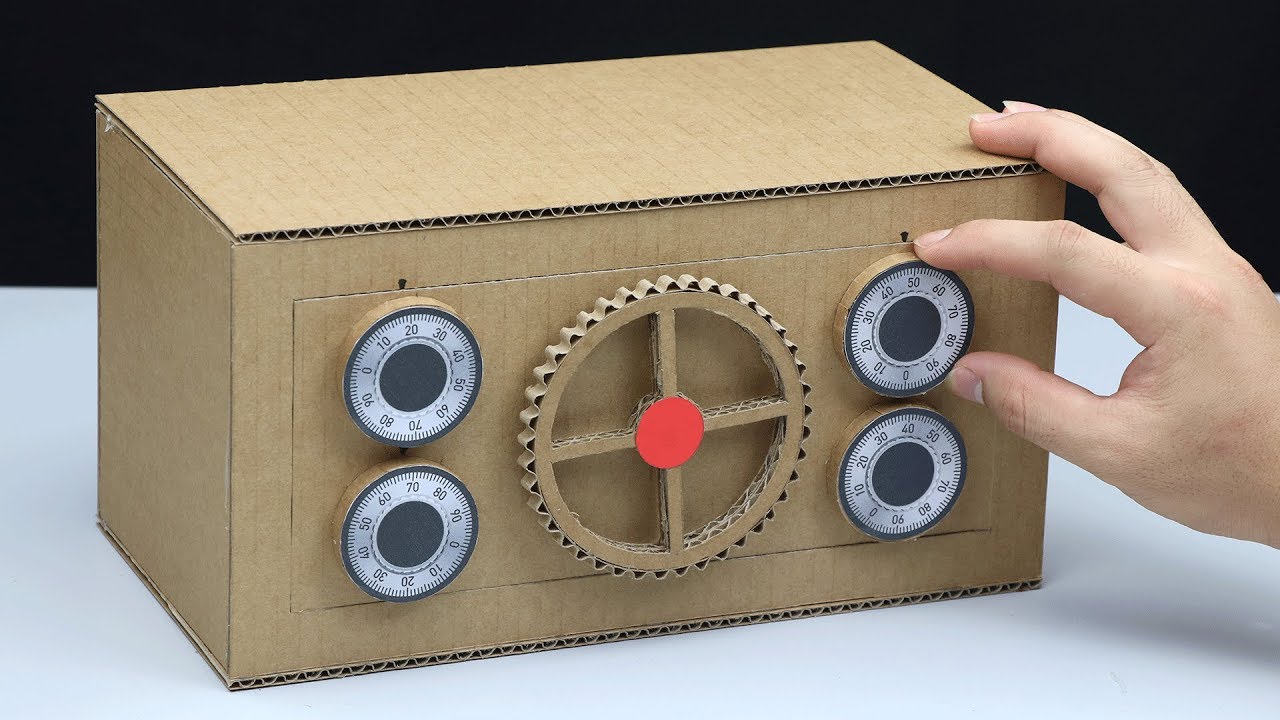 How to make a safe with dialing combination lock from cardboard. I just make it for fun and I want to share this idea to everyone. I hope you like it. Thank you for watching!! Please subscribe to get more interesting videos: https://www.youtube.com/channel/UCNZMEiM-ZMYmEk2CG3mr1_Q?sub_confirmation=1 You need: - Cardboard - Ice-cream stick - Bamboo BBQ sticks and chopstick - Pens - Bicycle spoke - Plastic gears Cardboard Measurement: ===================== (cm = centimeter) 4cm x 26cm = 1 piece 15cm x 15cm = 2 pieces 15cm x 30cm = 2 pieces 16cm x 30cm = 2 pieces Circle r = 2,5cm (8 pieces) r = 1,4cm (4 pieces) r = 5cm (2 pieces)