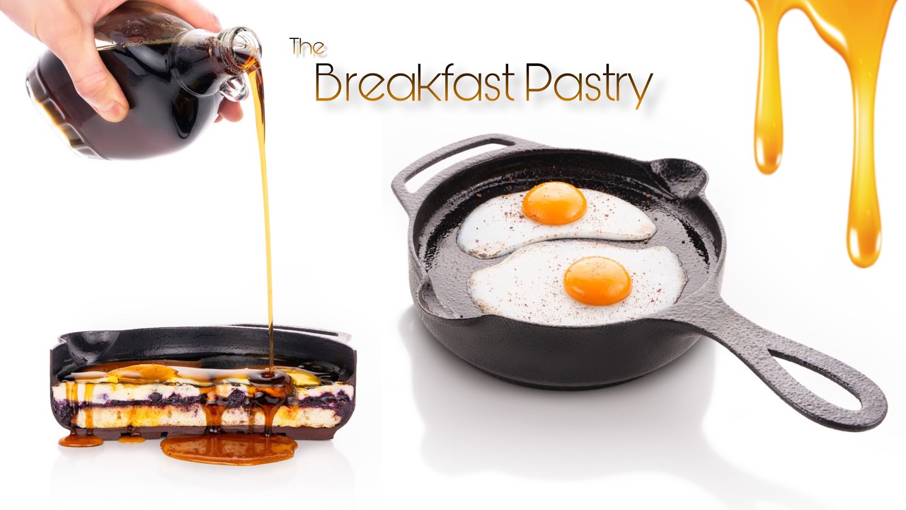 Start your day with a breakfast that's almost too beautiful to eat! This fully edible cast iron skillet is filled with sweet surprises: maple syrup-soaked vanilla pancake, blueberry compote, pancake mousse, and sunny-side-up eggs made from mango and passionfruit. And yes, every other element is crafted from rich dark chocolate. Who wants cake for breakfast?