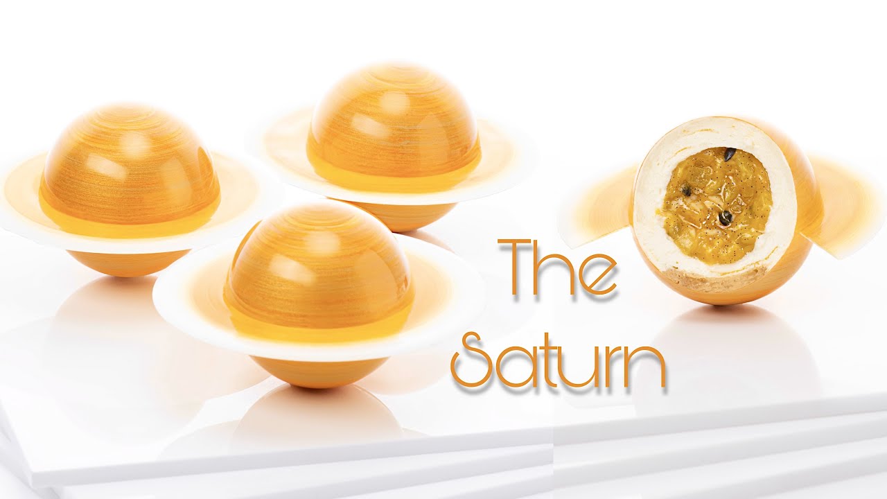 This accurate version of the Saturn is a gluten-free passion fruit cheesecake in disguise. It is composed with a marbling of cheesecake mousse and passion fruit jelly, a vanilla exotic compote in the center, a crunchy gluten-free recomposed streusel, and 2 thin shells of crunchy white chocolate. If you are looking to learn my techniques and recipes you can enroll to one of the long term programs by applying through my website : https://thepastryacademy.com