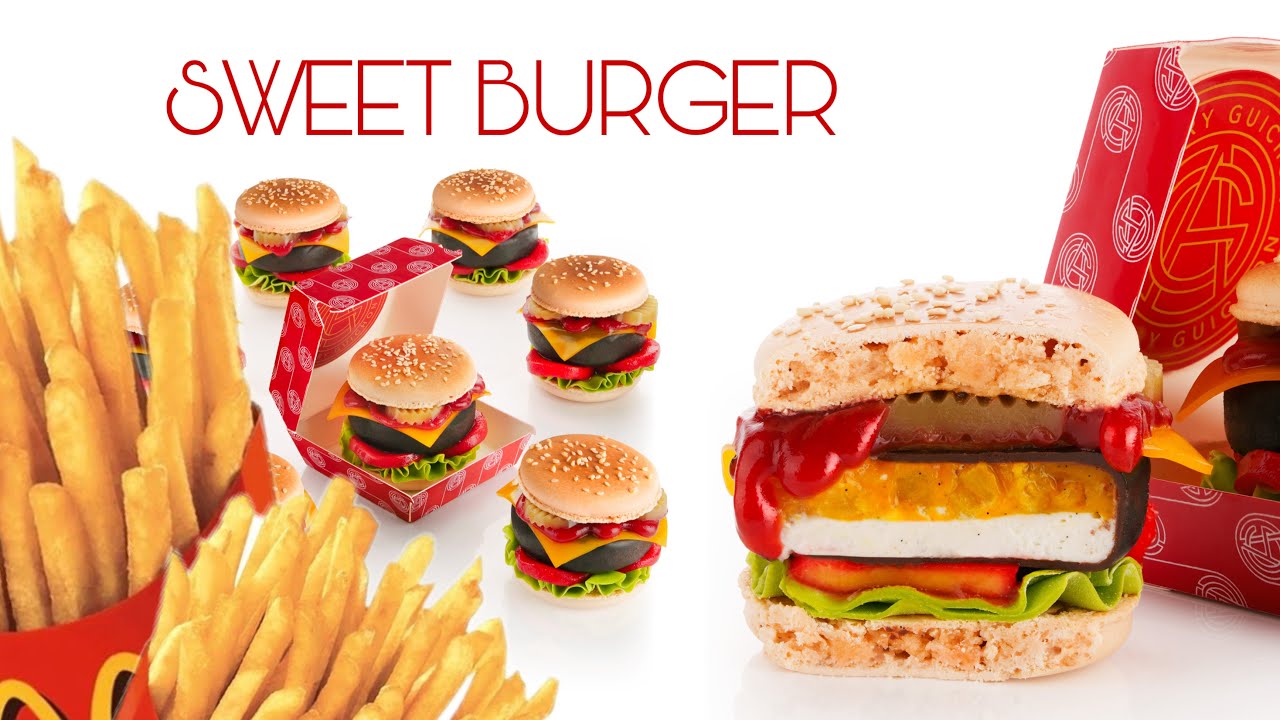 This pastry burger is a true illusion! Every single layer is carefully crafted to look like a savory burger but made entirely from sweet, fruity elements. The buns are almond macarons, the salad is passionfruit modeling chocolate, and the tomatoes are poached mango slices in cranberry syrup. The patty combines an exotic compote with vanilla coconut whip and a crunchy dark chocolate coating, while the ‘cheese’ is a passionfruit and mango jelly. The ketchup is a cranberry and strawberry reduction, and the pickles are fresh kiwi jelly. Of course, I couldn’t resist creating a chocolate burger box to complete the experience. Would you dare to take a bite of this sweet burger?