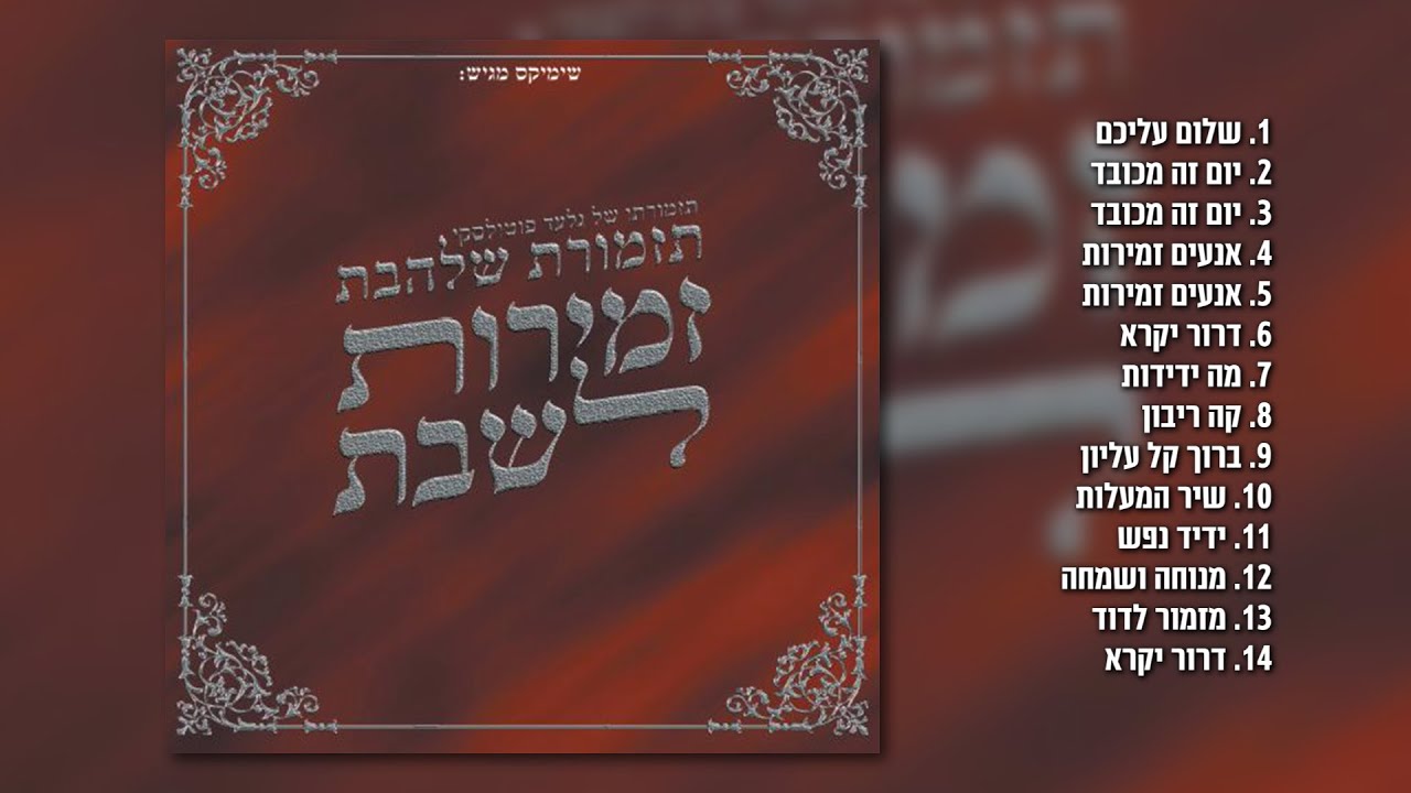 גלעד פוטולסקי ותזמורת שלהבת - זמירות לשבת חלק א' | האלבום המלא Zemirot Shabbat Part A 1. שלום עליכם מלאכי השרת מלאכי עליון, ממלך מלכי המלכים, הקדוש ברוך הוא. בואכם לשלום, מלאכי השלום מלאכי עליון, ממלך מלכי המלכים, הקדוש ברוך הוא. ברכוני לשלום מלאכי השלום מלאכי עליון, ממלך מלכי המלכים, הקדוש ברוך הוא. צאתכם לשלום, מלאכי השלום מלאכי עליון, ממלך מלכי המלכים, הקדוש ברוך הוא. 2-3. יום זה מכובד מכל ימים כי בו שבת צור עולמים. ששת ימים תעשה מלאכתך ויום השביעי לאלקיך, שבת לא תעשה בו מלאכה כי כל עשה ששת ימים. ראשון הוא למקראי קדש יום שבתון יום שבת קדש, על כן כל איש ביינו יקדש על שתי לחם יבצעו תמימים. אכול משמנים שתה ממתקים כי אל יתן לכל בו דבקים, בגד ללבוש לחם חקים בשר ודגים וכל מטעמים. לא תחסר כל בו ואכלת ושבעת וברכת את ה' אלקיך, אשר אהבת כי ברכך מכל העמים. השמים מספרים כבודו וגם הארץ מלאה חסדו, ראו כי כל אלה עשתה ידו כי הוא הצור פעלו תמים. 4-5. אנעים זמירות ושירים אערוג כי אליך נפשי תערוג, נפשי חמדה בצל ידיך לדעת כל רז סודך, מדי דברי בכבודך הומה ליבי אל דודך, על כן אדבר בך נכבדות ושמך אכבד בשירי ידידות, אספרה כבודך ולא ראיתיך אדמך אכנך ולא ידעתיך, ביד נביאך בסוד עבדיך דימית הדר כבוד הודך, גדולתך וגבורתך כינו לתוקף פעולתך, דימו אותך ולא כפי ישך וישווך לפי מעשיך, המשילוך ברוב חזיונות הינך אחד בכל דמיונות, ויחזו בך זקנה ובחרות ושיער ראשך בשיבה ושחרות, זקנה ביום דין ובחרות ביום קרב כאיש מלחמות ידיו לו רב, חבש כובע ישועה בראשו הושיע לו ימינו וזרוע קודשו, טללי אורות ראשו נמלא קוצותיו רסיסי לילה, יתפאר בי כי חפץ בי והוא יהיה לי לעטרת צבי, כתם טהור פז דמות ראשו וחק על מצח כבוד שם קדשו, לחן ולכבוד צבי תפארה אמתו לו עטרה עטרה. 6. דרור יקרא לבן עם בת וינצורכם כמו בבת, נעים שמכם ולא יושבת שבו ונוחו ביום שבת. דרוש נוי ואולמי ואות ישע עשה עימי, נטע שורק בתוך כרמי שעה שוועת בני עמי. דרך פורה בתוך בצרה וגם בבל אשר גברה, נתוץ צרי ועברה שמע קולי ביום אקרא. אלוהים תן במדבר הר הדס שיטה ברוש תדהר, ולמזהיר ולנזהר שלומים תן כמי נהר. הדוך קמי אל קנא, במוג לבב ובמנגינה, ונרחיב פה ונמלאנה, לשוננו לך רנה. דעה חכמה לנפשך, והיא כתר לראשך, נצור מצוות קדושך, שמור שבת קדשך. 7. מה ידידות מנוחתך 8. קה ריבון עלם ועלמיא 9. ברוך קל עליון 10. שיר המעלות 11. ידיד נפש 12. מנוחה ושמחה 13. מזמור לדוד 14. דרור יקרא לשמיעת כל שירי גלעד פוטולסקי ותזמורת שלהבת To hear all the songs of Gilad Potolsky and Shalhevet Orchestra ספוטיפיי - Spotify https://open.spotify.com/artist/0qYJ1FO8HqG5JKXOC4zDrl אפל מיוזיק - Apple Music https://music.apple.com/mx/artist/%D7%92%D7%9C%D7%A2%D7%93-%D7%A4%D7%95%D7%98%D7%95%D7%9C%D7%A1%D7%A7%D7%99/1535636972 דיזר - Deezer https://www.deezer.com/us/artist/122645762?utm_campaign=clipboard-generic&utm_source=user_sharing&utm_medium=desktop&utm_content=artist-122645762&deferredFl=1 אמזון - Amazon Music https://music.amazon.es/artists/B08W2JCHYC/%D7%92%D7%9C%D7%A2%D7%93-%D7%A4%D7%95%D7%98%D7%95%D7%9C%D7%A1%D7%A7%D7%99 יוטיוב - YouTube 👇👇 הנשמה לך 1 "תזמורת שלהבת בהופעה חיה" https://www.youtube.com/watch?v=xoHGNv6Ju7s&list=PLlCtSPZEQF7rknCKF4H90MdnezkCgCzRj הנשמה לך 2 יחד יחד https://www.youtube.com/watch?v=3RDSkJwEyQU&list=PLlCtSPZEQF7p338aehtjpu-DyZOPslXsX הנשמה לך 3 והתענג על השם https://www.youtube.com/watch?v=D55ZLeb-iqY&list=PLlCtSPZEQF7r03EdPCquynLbS1711L7fX הנשמה לך 4 ושיר אערוך לך https://www.youtube.com/watch?v=UTdaWQbJ0VU&list=PLlCtSPZEQF7qZA_jRdeMjLyXlda0d4bmE הנשמה לך 5 בניגון ובנעימה https://www.youtube.com/watch?v=YLPyBXooB70&list=PLlCtSPZEQF7oBb1w_m-JGkESP--1P75n_ הנשמה לך 6 ושבתי https://www.youtube.com/watch?v=zukpc0iWsr8&list=PLlCtSPZEQF7p9HNGCX9IKVhSCwmX1wBMI הנשמה לך 7 בנין עדי עד https://www.youtube.com/watch?v=YcKPFGo9I3E&list=PLlCtSPZEQF7p_idvSzKsqD4XsYwu1DBMt הנשמה לך 8 שמחת בית השואבה https://www.youtube.com/watch?v=AMQ4vq0apsc&list=PLlCtSPZEQF7pGN97hWBichNDi-CF3vY6i הנשמה לך 9 להודות ולהלל https://www.youtube.com/watch?v=NzayiQmDQao&list=PLlCtSPZEQF7rCsqkB9rAf6avnFMkw0_jn זמירות לשבת https://www.youtube.com/watch?v=ojGlPkm8bjk&list=PLlCtSPZEQF7rPBImmtT-rZsVHo22pyuv_ סינגלים https://www.youtube.com/watch?v=wq7Bb_hM1Oc&list=PLlCtSPZEQF7p_7jnrGHXlGFkhRjYk9sb4 שירים חסידיים / מוזיקה חסידית / שירי נשמה / שירי קרליבך / שירי רגש / להקת שלהבת / שירים לימים הנוראים / שירים לראש השנה / שירים ליום כיפור / ש