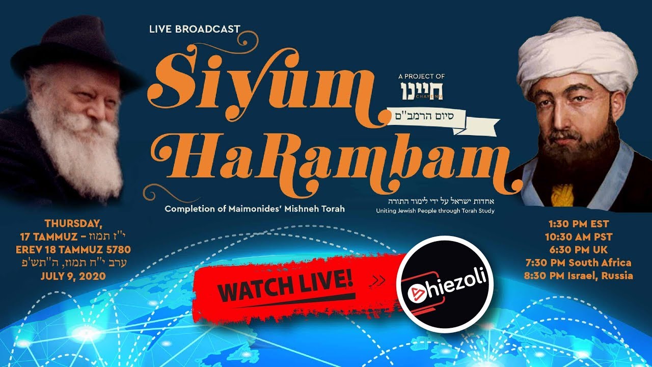 Join Jews all around the world, in celebrating the Completion of Rambam's (Maimonides') Mishneh Torah. This live event on 17 Tammuz, 5780 (July 9, 2020) will bring together thousands of Jews who study Rambam Yomi, the daily Rambam in one of three tracks: 3 chapters per day, 1 chapter per day, Sefer Hamitzvos. The Broadcast will include a Live Siyum at the Lubavticher Rebbe's Ohel in New York, the Rambam's Tomb in Tiberias, Israel and Johannesburg, South Africa. Additionally: ~ An interview with the translator of Mishneh Torah into English, Rabbi Eli Touger ~ An Up-Close view of a Manuscript of Maimonides ~ Hear from Lay Leaders and Businessmen around the world on how Daily Rambam Study has affected their personal life. More info on https://www.siyum.live/ Organized by Chayenu, A weekly Torah publication https://chayenu.org/ Produced by A Team Productions Dovid Weinbaum Filming & Broadcasting Yankee Teitelbaum & Bracha Torenheim of Flowmotion Studio’s #SiyumHaRambam