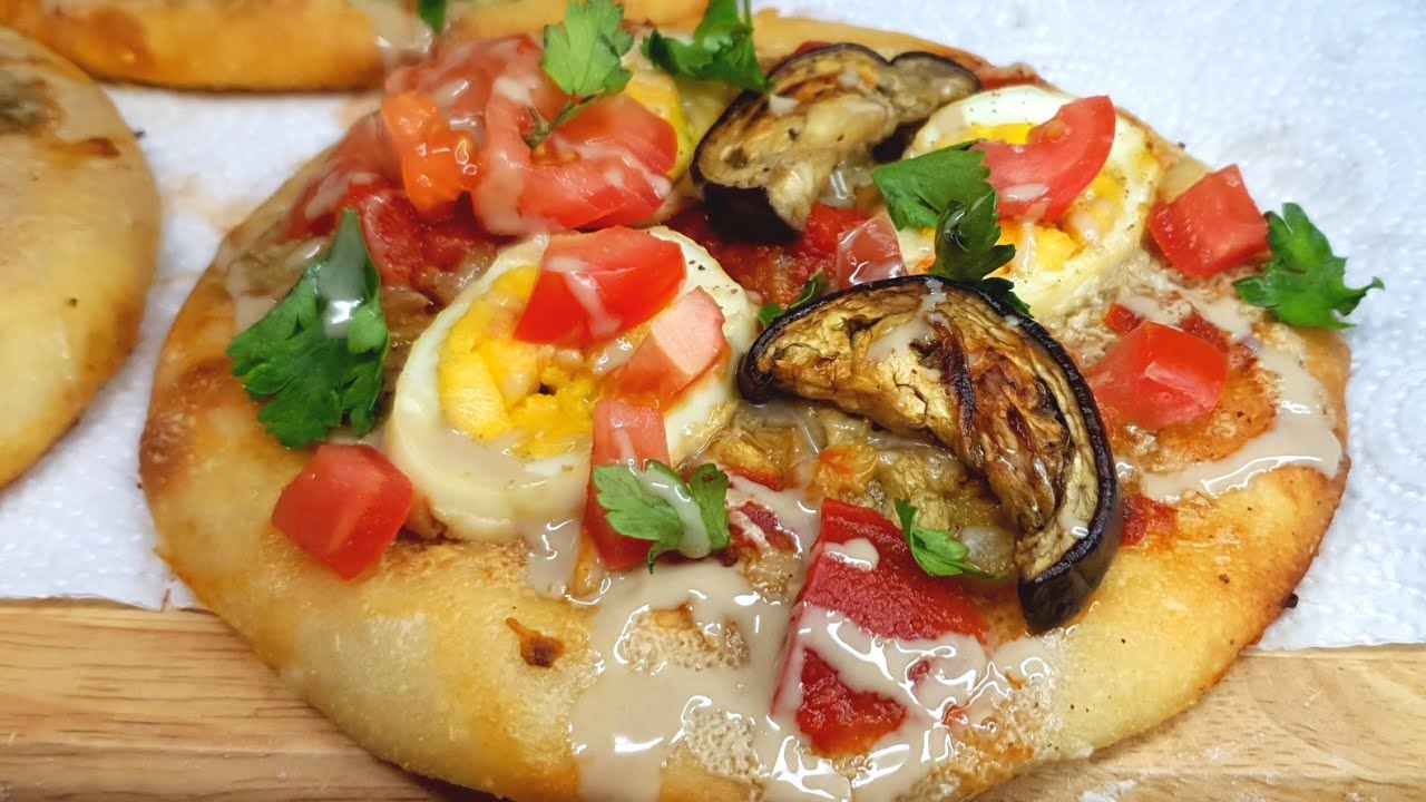 פיתה ביתיות משגעות סביח עם תוספות,חציל על האש ,טחינה ,ביצים פרווה,צמחוני מטבח בקלי קלות ליהי קרויץ