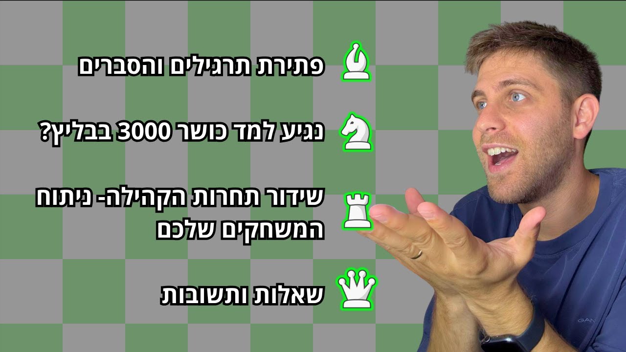 הצטרפו לשידור חי שבו אני אתמודד עם אתגרים בשחמט במשך 4-5 שעות. במהלך השידור, אני אנסה להגיע למד כושר 3000 בבליץ, אפתור תרגילים ואסביר את דרך החשיבה שלי במהלך המשחקים. מה מצפה לכם בשידור הזה? תרגולים בשחמט עם הסברים על המהלכים. סשן שאלות ותשובות שבו אני אענה על השאלות שלכם בנוגע לשחמט, טקטיקות ודרכי שיפור. והדובדבן שבקצפת – תחרות שחמט בליץ של קהילת השחמט שלי, שבה אני אפרשן את המשחקים בזמן אמת. אם אתם שחקני שחמט, מאמנים או תלמידי שחמט, השידור הזה יכול לעזור לכם לשפר את המשחק ולהבין איך ניתן ליישם אסטרטגיות שונות במהלך המשחק. אל תשכחו לעשות לייק, להירשם לערוץ ולהפעיל את הפעמון כדי לא לפספס את השידורים הבאים! 🎥🔥 🎓 לימוד שחמט בכיף לילדים: 🔹https://www.chessworld.io/ 🔹אייפון: https://apps.apple.com/us/app/chessworld-chess-for-kids/id1112656776 🔹אנדרואיד: https://play.google.com/store/apps/details?id=com.altermanchess.AltermanChessEdu 🎁 קוד קופון בלעדי: קבלו 20% הנחה על רכישת מנוי מתקדם באפליקציה הקוד: nitzan2025 ,בתוקף עד ה־30.9 הירשמו בחינם לאתר שידהים אותכם! באמצעותו תוכלו ללמוד פתיחות, לשנן וריאנטים, לשפר את הזיכרון ולהשתפר בשחמט ופשוט לנצח. https://www.chessshare.com/# ♟️ הירשמו ל-Outpost – הבית החדש לשחקני שחמט: https://outpostchess.com/?utm_source=YouTube&utm_medium=Nitzan אימייל לשליחת משחקים עבור נחש את מד הכושר ונחש את הערכת העמדה! nitzan.steinberg18@gmail.com 🎯 הצטרפו עכשיו לקבוצת הליצ'ס של הקהילה! 🏆 תחרויות, פרסים, ועוד הפתעות! 🔗 https://lichess.org/team/DR3Y5DS6 | סיסמה: 2025! 💙 נהנים מהתכנים שלי? אפשר לתמוך כאן: https://www.paypal.me/NitzanSteinbergChess 📱 הרשתות החברתיות שלי: 🔹 אינסטגרם: https://www.instagram.com/nitzan_steinberg_/ 🔹 טוויץ': https://www.twitch.tv/nitzansteinbergchess 🔹 פייסבוק: https://www.facebook.com/nitzan.steinberg 🔹 דיסקורד: https://discord.com/invite/t8Anrz5VpM 🔹טוויטר: https://twitter.com/SteinbergNitza1 🔹ערוץ יוטיוב באנגלית: https://www.youtube.com/@UCOPwWRP_SvWb7r6pnfs41Ww 🔹לינקדין: https://www.linkedin.com/in/nitzan-steinberg-a62112217/ 💬 קבוצת וואטסאפ פתוחה: 🔹https://chat.whatsapp.com/EdTr2ZCClu1HX9HHEpEhsx ♟️ פרופילים אישיים שחמט 🔹פידה: https://ratings.fide.com/profile/2801795 🔹בצ'ס קום: https://www.chess.com/member/nitzan_steinberg 🔹בליצ'ס: https://lichess.org/@/Nizi3