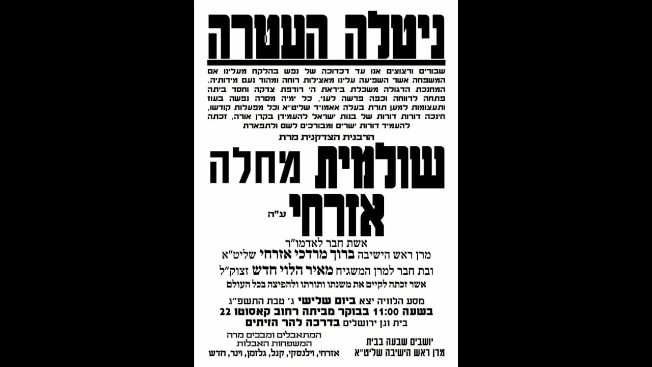 צפייה ישירה ב-YouTubeמסע ההלוויה של הרבנית הצדקנית מרת שולמית אזרחי ע”ה