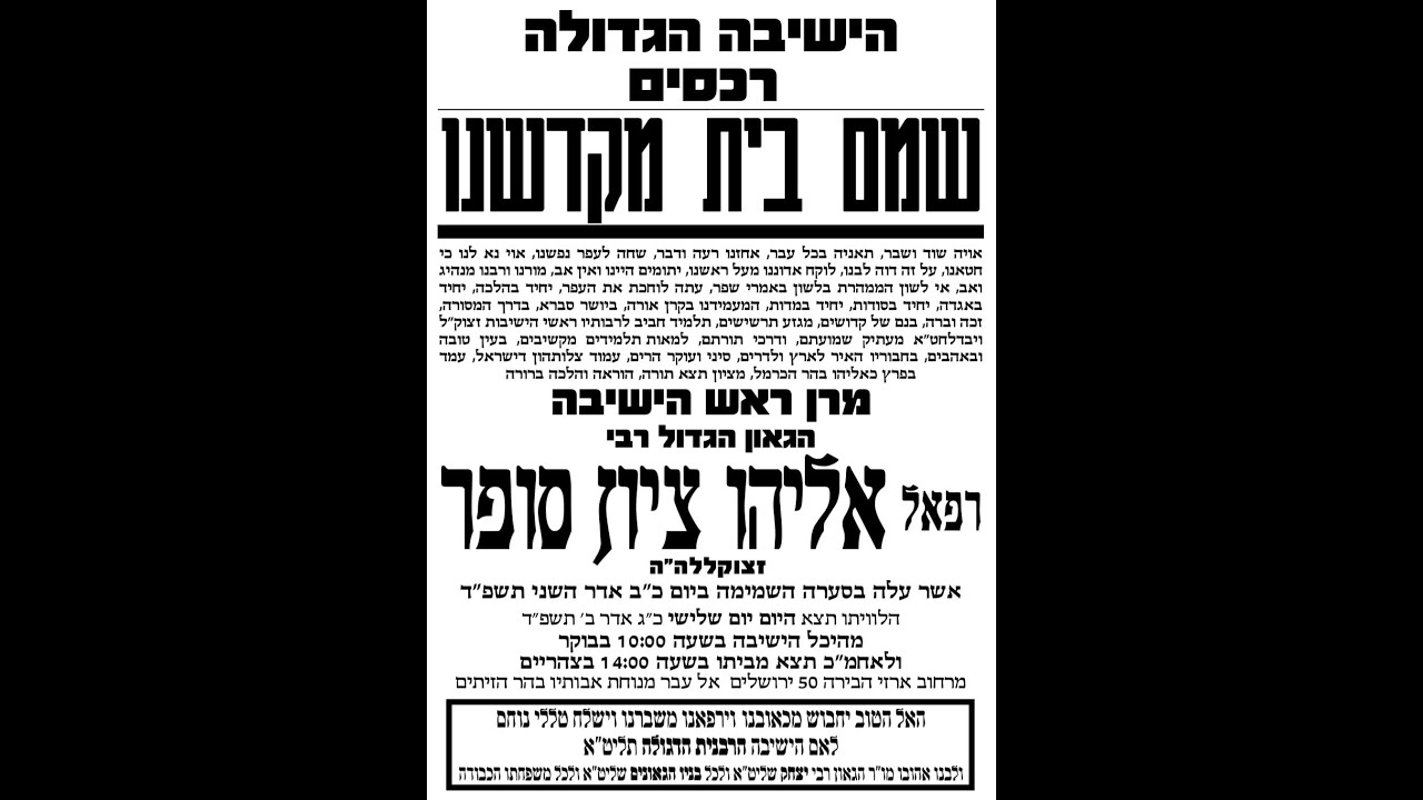 צפייה ישירה ב-YouTubeמסע ההלוויה של ראש הישיבה הגאון האדיר מרן רבינו אליהו ציון סופר זצ”ל