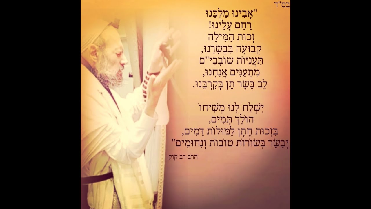 "אָבִינוּ מַלְכֵּנוּ רַחֵם עָלֵינוּ! זְכוּת הַמִּילָה קְבוּעָה בִּבְשָׂרֵנוּ, תַּעֲנִיּוֹת שוֹבָבִי"ם מִתְעַנִּים אֲנַחְנוּ, לֵב בָּשָׂר תֵּן בְּקִרְבֵּנוּ. יִשְׁלַח לָנוּ מְשִׁיחוֹ הוֹלֵךְ תָּמִים, בִּזְכוּת חָתָן לַמּוּלוֹת דָּמִים, יְבַשֵּׂר בְּשׂוֹרוֹת טוֹבוֹת וְנִחוּמִים"