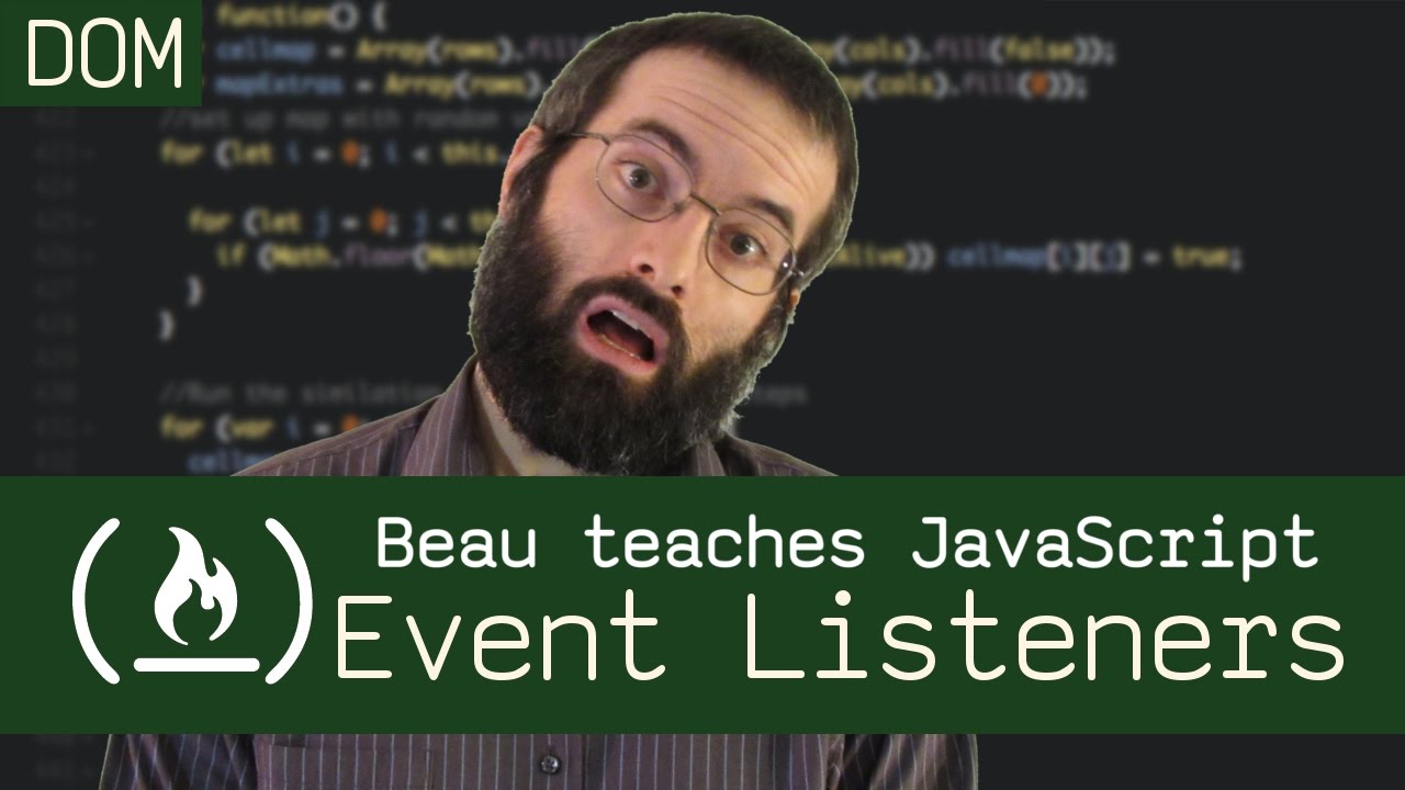 The addEventListener() method attaches an event handler to the specified element without overwriting existing event handlers so you can add many event handlers to one element. You can use removeEventListener() to remove an event. 💻 Code: https://codepen.io/beaucarnes/pen/JNRKXX?editors=1010 🔗 All DOM events: https://developer.mozilla.org/en-US/docs/Web/Events 🐦 Beau Carnes on Twitter: https://twitter.com/carnesbeau ⭐JavaScript Tutorials Playlists⭐ ▶JavaScript Basics: https://www.youtube.com/playlist?list=PLWKjhJtqVAbk2qRZtWSzCIN38JC_NdhW5 ▶Data Structures and Algorithms: https://www.youtube.com/playlist?list=PLWKjhJtqVAbkso-IbgiiP48n-O-JQA9PJ ▶Design Patterns: https://www.youtube.com/playlist?list=PLWKjhJtqVAbnZtkAI3BqcYxKnfWn_C704 ▶ES6: https://www.youtube.com/playlist?list=PLWKjhJtqVAbljtmmeS0c-CEl2LdE-eR_F ▶Clean Code: https://www.youtube.com/playlist?list=PLWKjhJtqVAbkK24EaPurzMq0-kw5U9pJh - We're busy people who learn to code, then practice by building projects for nonprofits. Learn Full-stack JavaScript, build a portfolio, and get great references with our open source community. Join our community at https://freecodecamp.com Read great tech articles at https://medium.freecodecamp.com ❤️ Support for this channel comes from our friends at Scrimba – the coding platform that's reinvented interactive learning: https://scrimba.com/freecodecamp