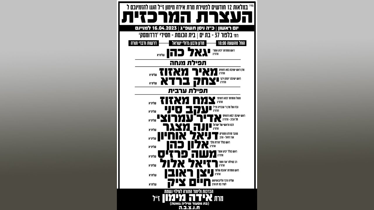 צפייה ישירה ב-YouTubeהעצרת המרכזית | בת ים | לעילוי נשמת מרת אידה מימון ז"ל
