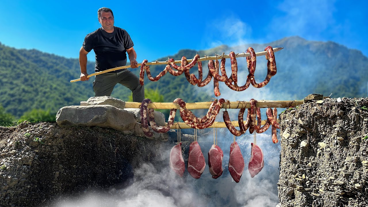 Primitive Technology Of Cooking Homemade Hot Smoked Meat In The Mountains!