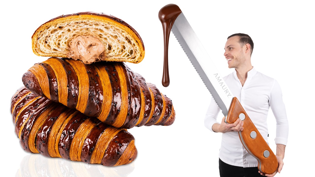 SUBSCRIBE: Instagram: https://www.instagram.com/amauryguichon Facebook: https://www.facebook.com/amauryguichon.chef/ Tiktok: https://www.tiktok.com/@amauryguichon Snapchat: https://www.snapchat.com/@amauryguichonsc What happens when you scale a croissant to an entirely new level? This giant chocolate chip croissant is built from the ground up with precise lamination to preserve the iconic honeycomb structure—just on a massive scale. To reveal what’s inside, I crafted a custom chocolate bread knife capable of slicing clean through the layers, exposing the airy interior and rich chocolate filling. The real challenge wasn’t making it bigger—it was keeping the texture, structure, and balance exactly as a perfect croissant should be. Would you dare to cut into it?