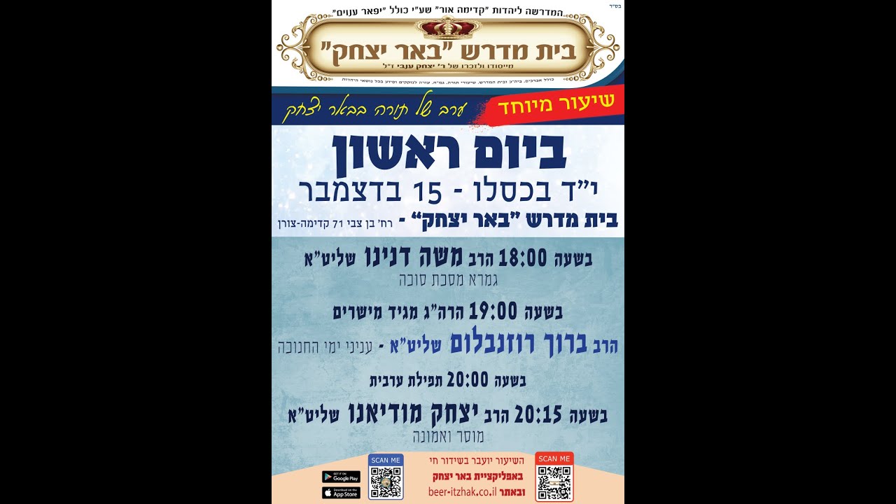https://www.youtube.com/@beer-itzhak "חדש!!! עכשיו גם אפליקציה במכשירי אנדורייד " באר יצחק עקבו אחרינו ושתפו חברים לצפייה במגוון שיעורים מפי מיטב הרבנים שיעורים מתקיים בכל יום מהשעה 19:00-20:00 & 20:15-21:45 בבית המדרש באר יצחק - קדימה רח' בן צבי 71 https://beer-itzhak.co.il/