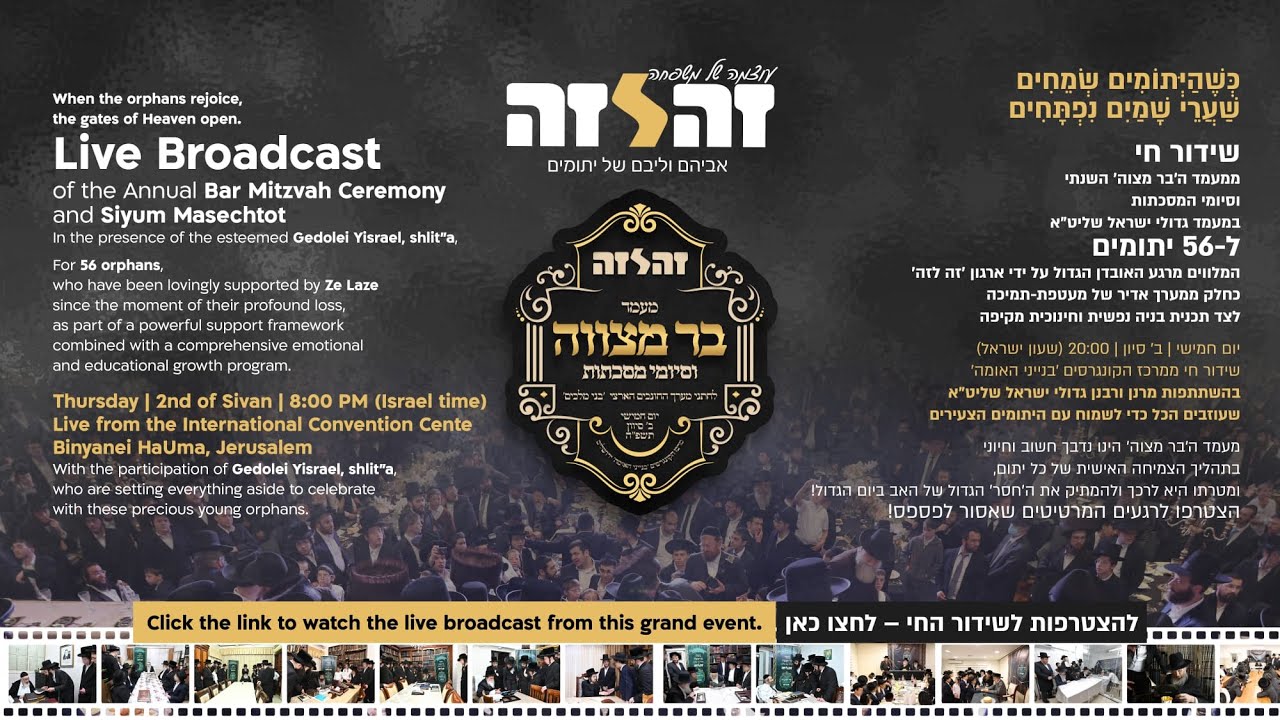 https://webmofsite.wixsite.com/ze-leze When the orphans rejoice, the gates of Heaven open. Live Broadcast of the Annual Bar Mitzvah Ceremony and Siyum Masechtot In the presence of the esteemed Gedolei Yisrael, shlit”a, For 56 orphans, who have been lovingly supported by Ze Laze, since the moment of their profound loss, as part of a powerful support framework, combined with a comprehensive emotional and educational growth program. Thursday | 2nd of Sivan | 8:00 PM (Israel time) Live from the International Convention Center – Binyanei HaUma, Jerusalem With the participation of Gedolei Yisrael, shlit”a, who are setting everything aside to celebrate with these precious young orphans. This Bar Mitzvah Ceremony is a vital milestone in the personal growth of each orphan, designed to soften and sweeten the painful absence of a father on this most significant day. Join these powerful, emotional moments — a broadcast not to be missed!