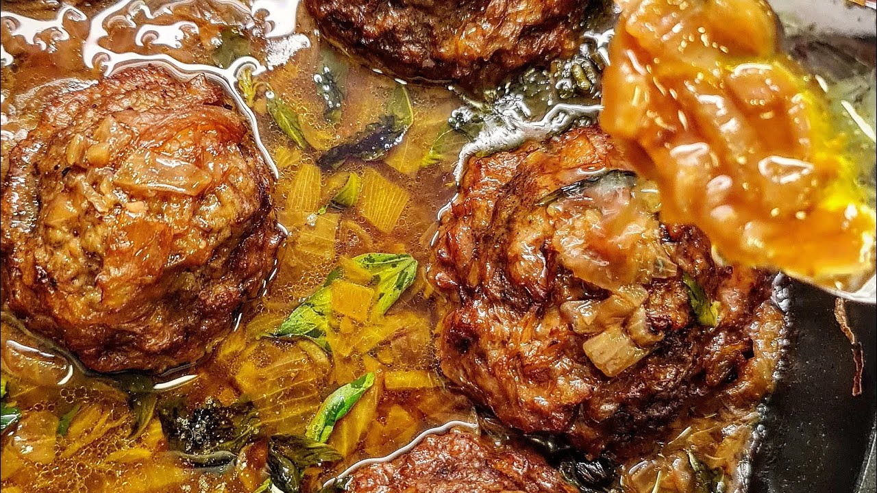 פטריות ממולאות בבשר ברוטב בצלים מקורמל מפחיד