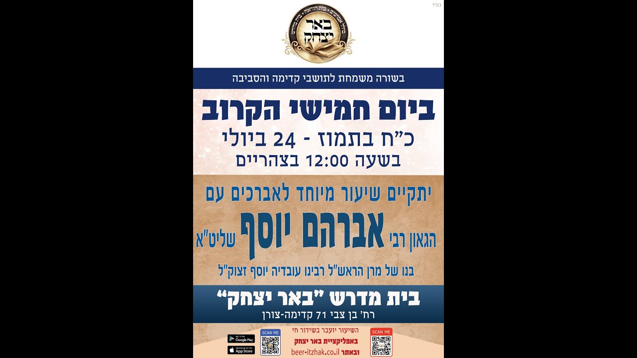 עזרו לנו להגיע 500 מינויים ותהיו שותפים בזיכוי הרבים https://www.youtube.com/@beer-itzhak "חדש!!! עכשיו גם אפליקציה במכשירי אנדורייד ואפל " באר יצחק עקבו אחרינו ושתפו חברים לצפייה במגוון שיעורים מפי מיטב הרבנים שיעורים מתקיים בכל יום מהשעה 19:00-20:00 & 20:15-21:45 בבית המדרש באר יצחק - קדימה רח' בן צבי 71 https://beer-itzhak.co.il/