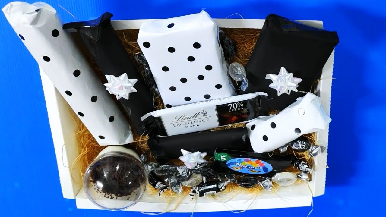הכנת משלוח מנות שחור לבן לכבוד פורים. קנו את הממתקים שאתם אוהבים ועטפו אותם בעטיפות שחור ולבן. אפשר להוסיף גם קש בתחתית האריזה. רעיון נחמד למשלוח מנות בהכנה עצמית.